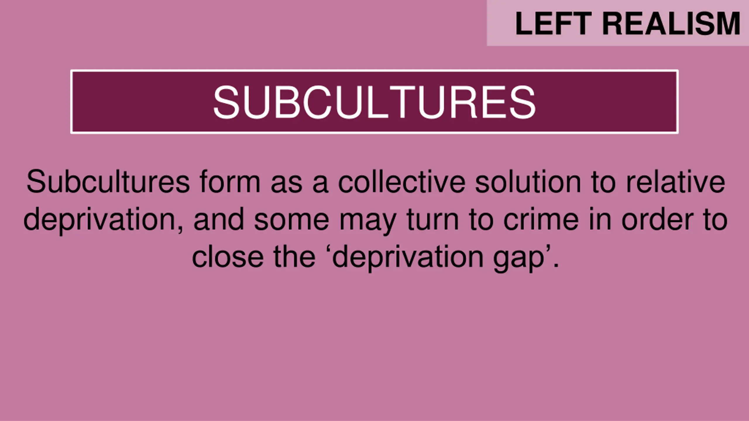 LEFT REALISM SUBCULTURES Subcultures form as a collective solution to relative deprivation, and some may turn to crime in order to close the deprivation gap .