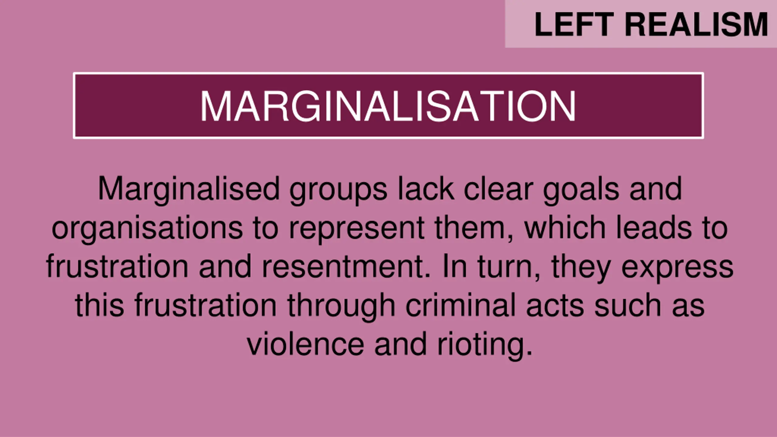 LEFT REALISM MARGINALISATION Marginalised groups lack clear goals and organisations to represent them, which leads to frustration and resentment. In turn, they express this frustration through criminal acts such as violence and rioting.