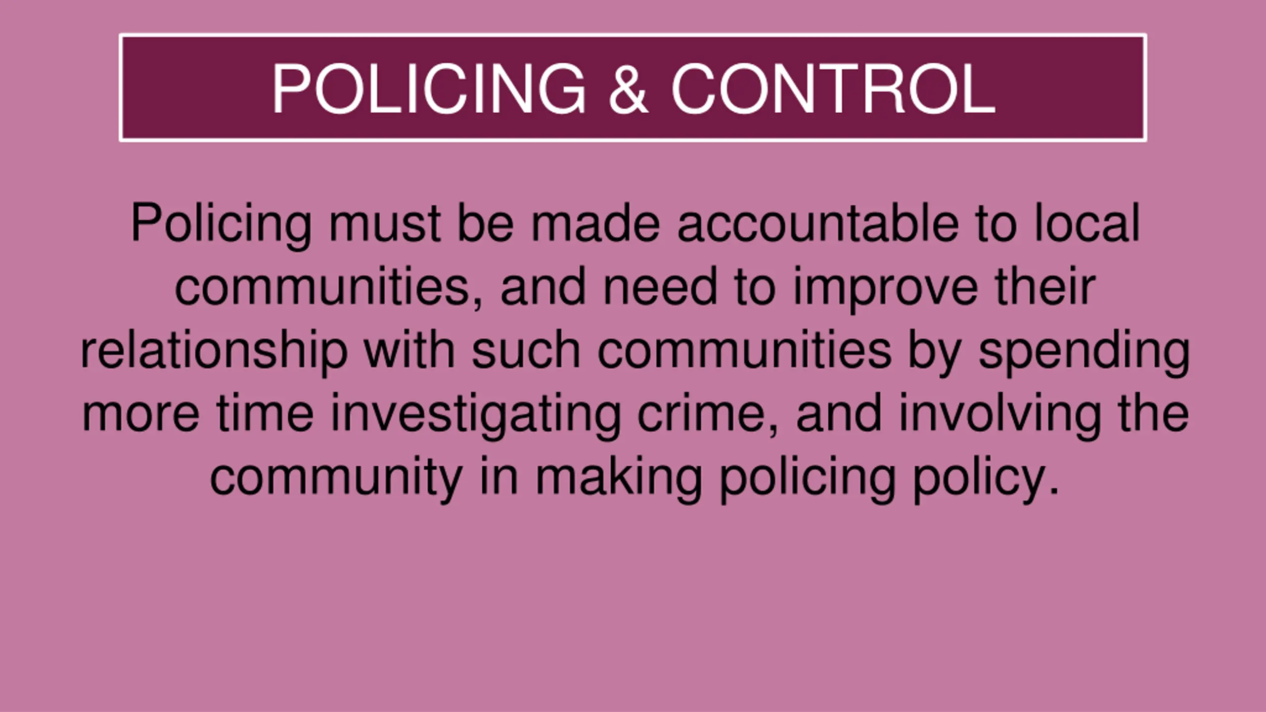 POLICING & CONTROL Policing must be made accountable to local communities, and need to improve their relationship with such communities by spending more time investigating crime, and involving the community in making policing policy.