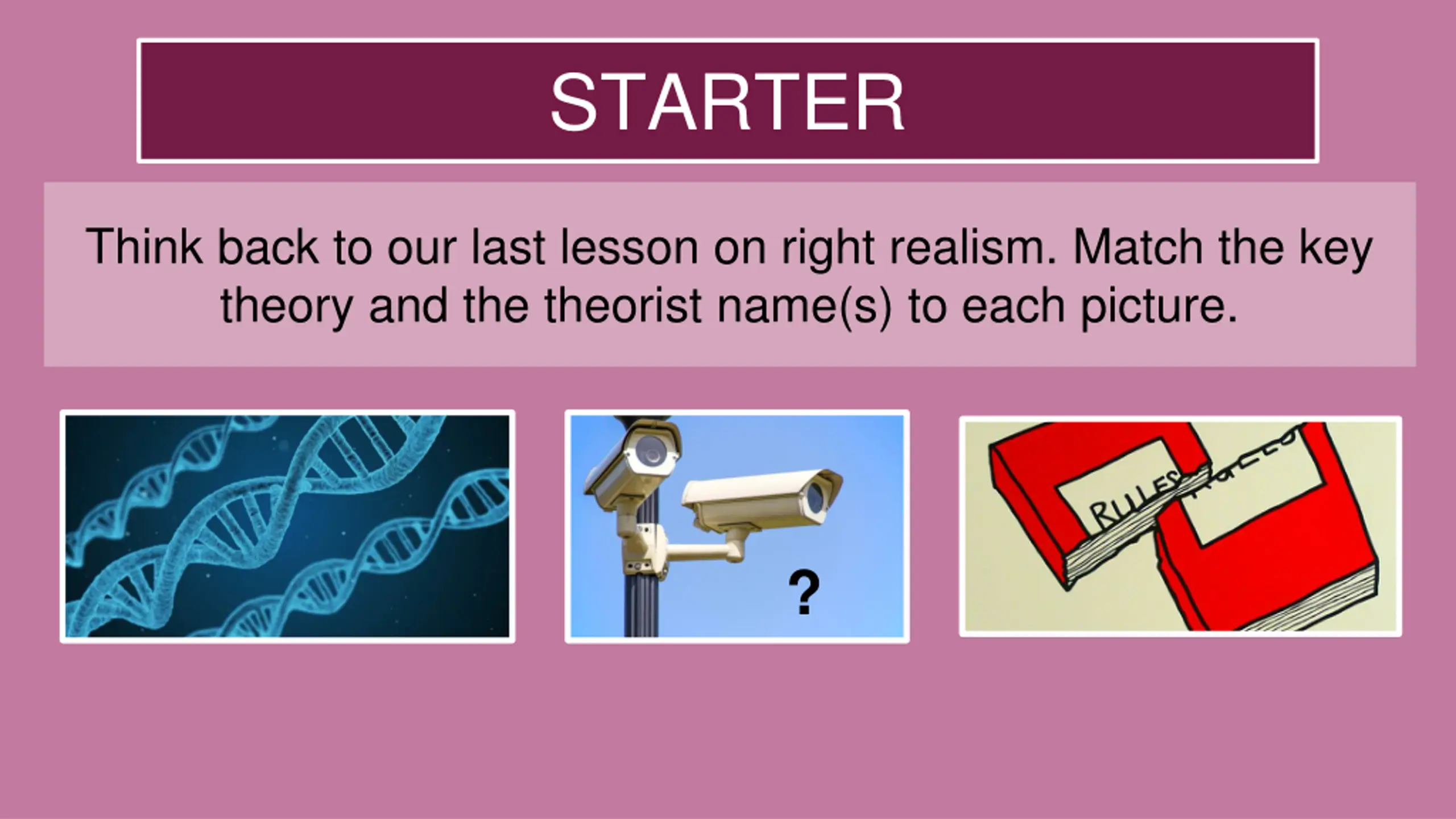 STARTER Think back to our last lesson on right realism. Match the key theory and the theorist name(s) to each picture. ?