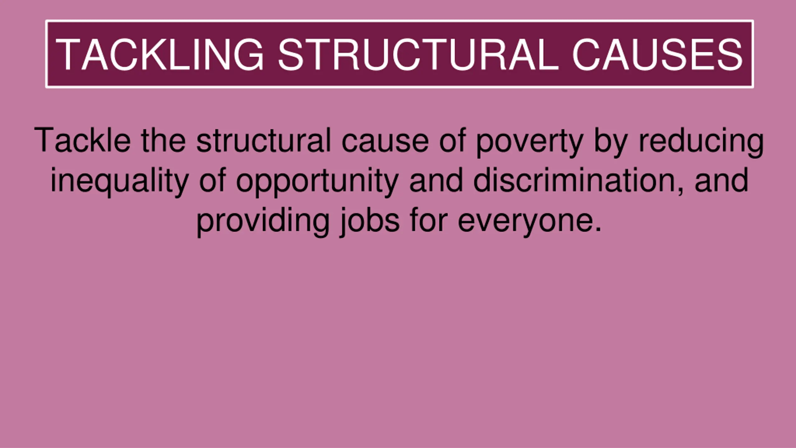 TACKLING STRUCTURAL CAUSES Tackle the structural cause of poverty by reducing inequality of opportunity and discrimination, and providing jobs for everyone.