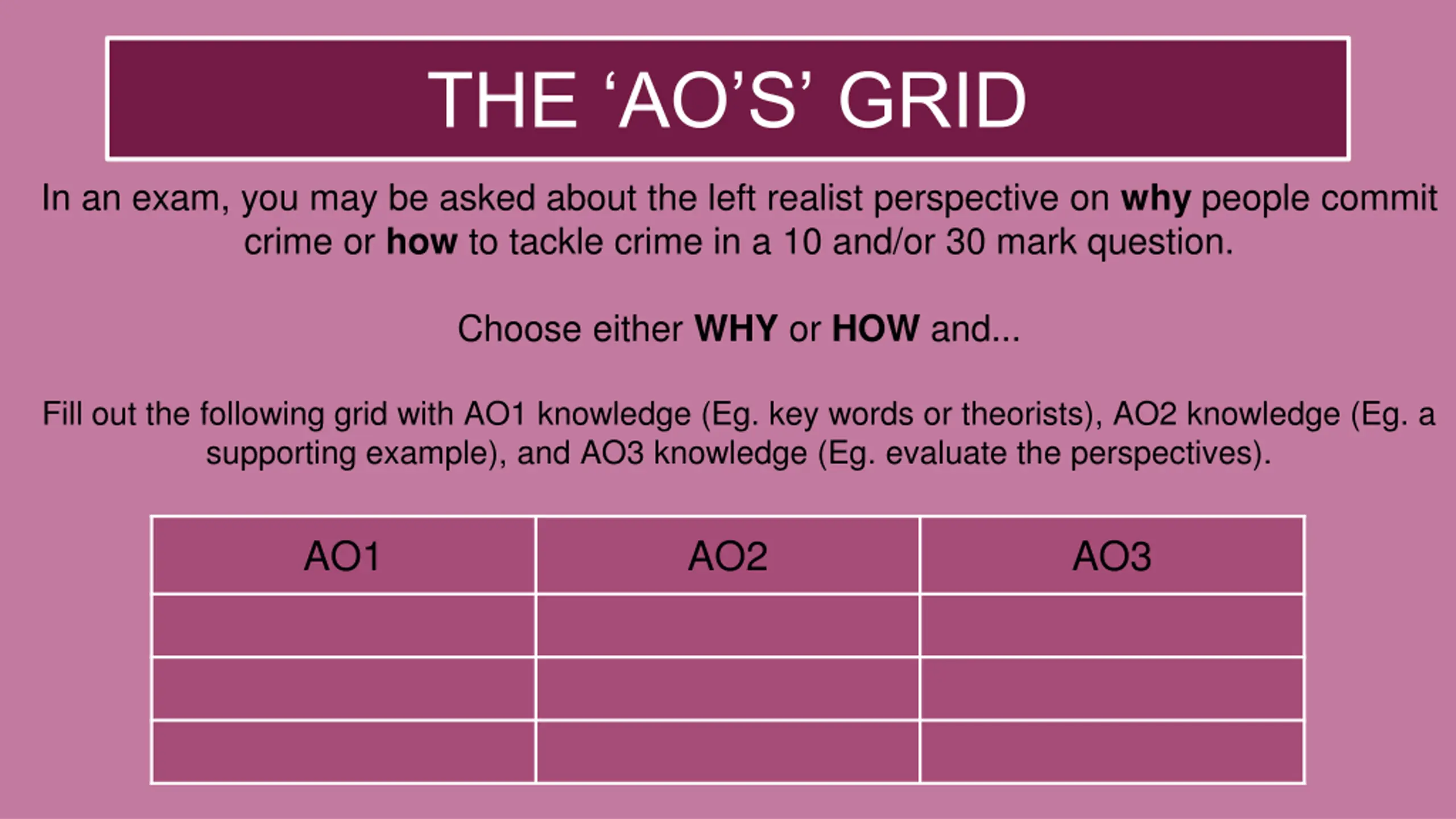 THE AOS GRID In an exam, you may be asked about the left realist perspective on why people commit crime or how to tackle crime in a 10 and/or 30 mark question. Choose either WHY or HOW and... Fill out the following grid with AO1 knowledge (Eg. key words or theorists), AO2 knowledge (Eg. a supporting example), and AO3 knowledge (Eg. evaluate the perspectives). AO1 AO2 AO3
