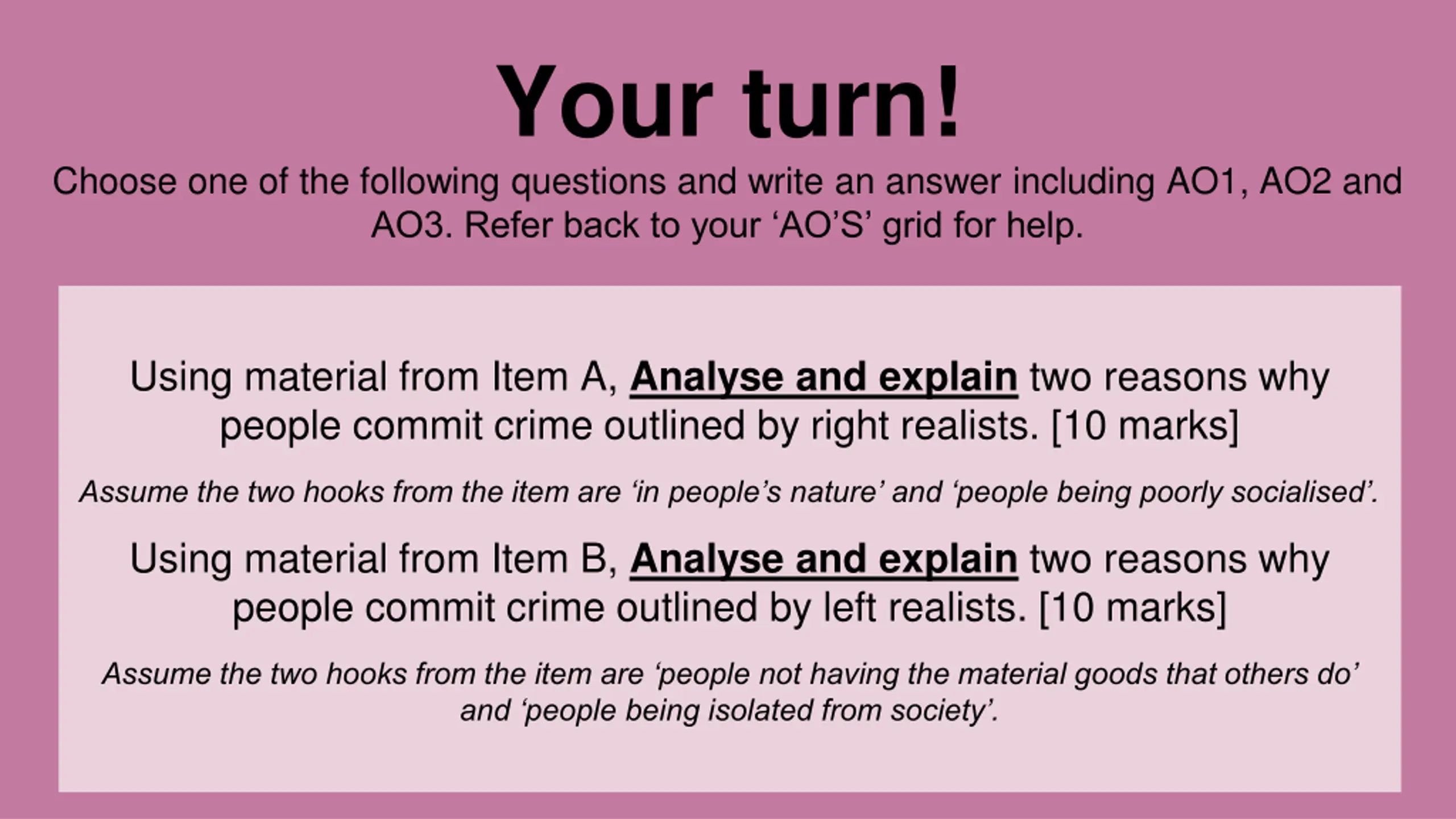 Your turn! Choose one of the following questions and write an answer including AO1, AO2 and AO3. Refer back to your AO S grid for help. Using material from Item A, Analyse and explain two reasons why people commit crime outlined by right realists. [10 marks] Assume the two hooks from the item are in people s nature and people being poorly socialised . Using material from Item B, Analyse and explain two reasons why people commit crime outlined by left realists. [10 marks] Assume the two hooks from the item are people not having the material goods that others do and people being isolated from society .