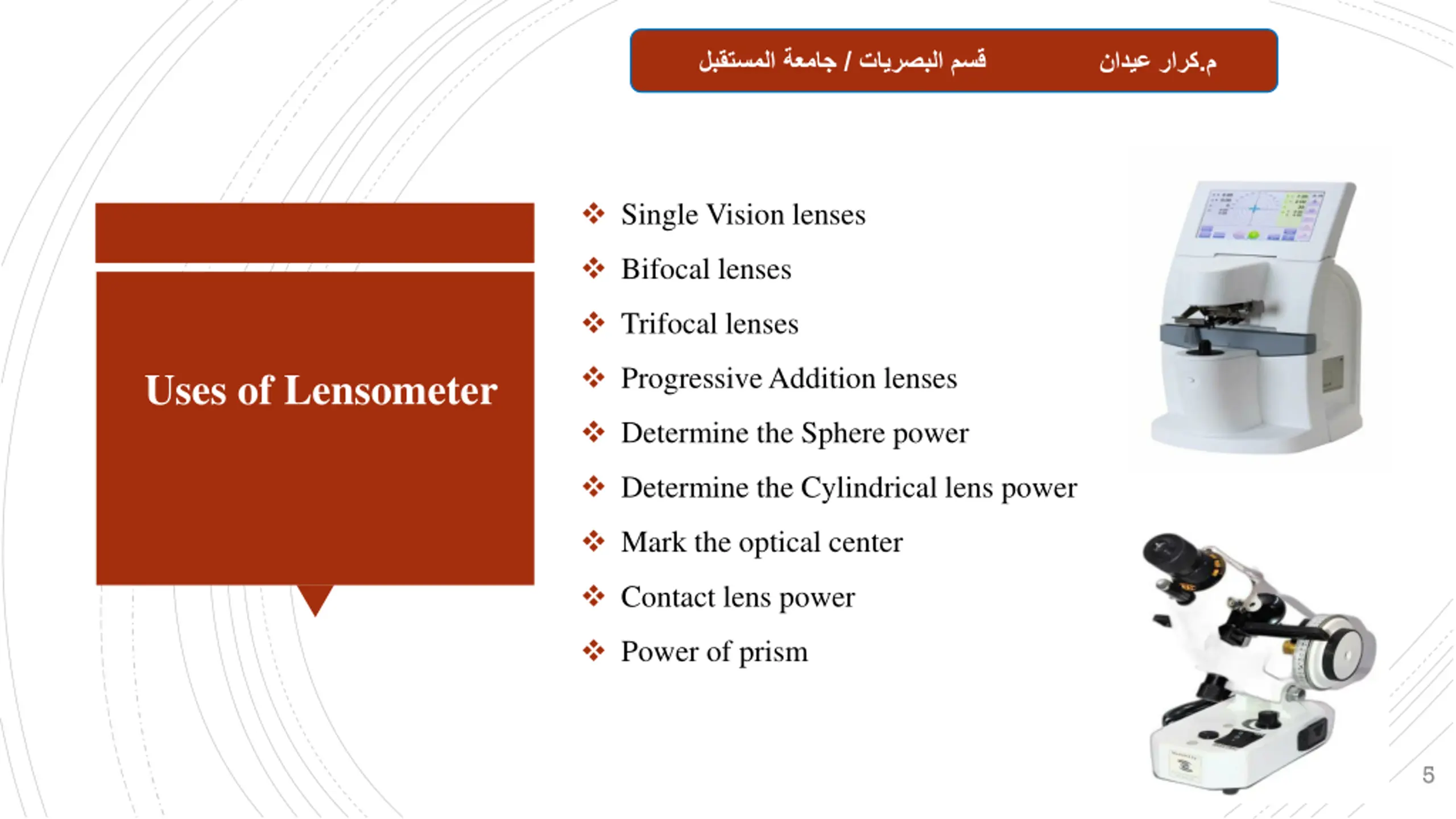 / . Single Vision lenses Bifocal lenses Trifocal lenses Progressive Addition lenses Uses of Lensometer Determine the Sphere power Determine the Cylindrical lens power Mark the optical center Contact lens power Power of prism 5