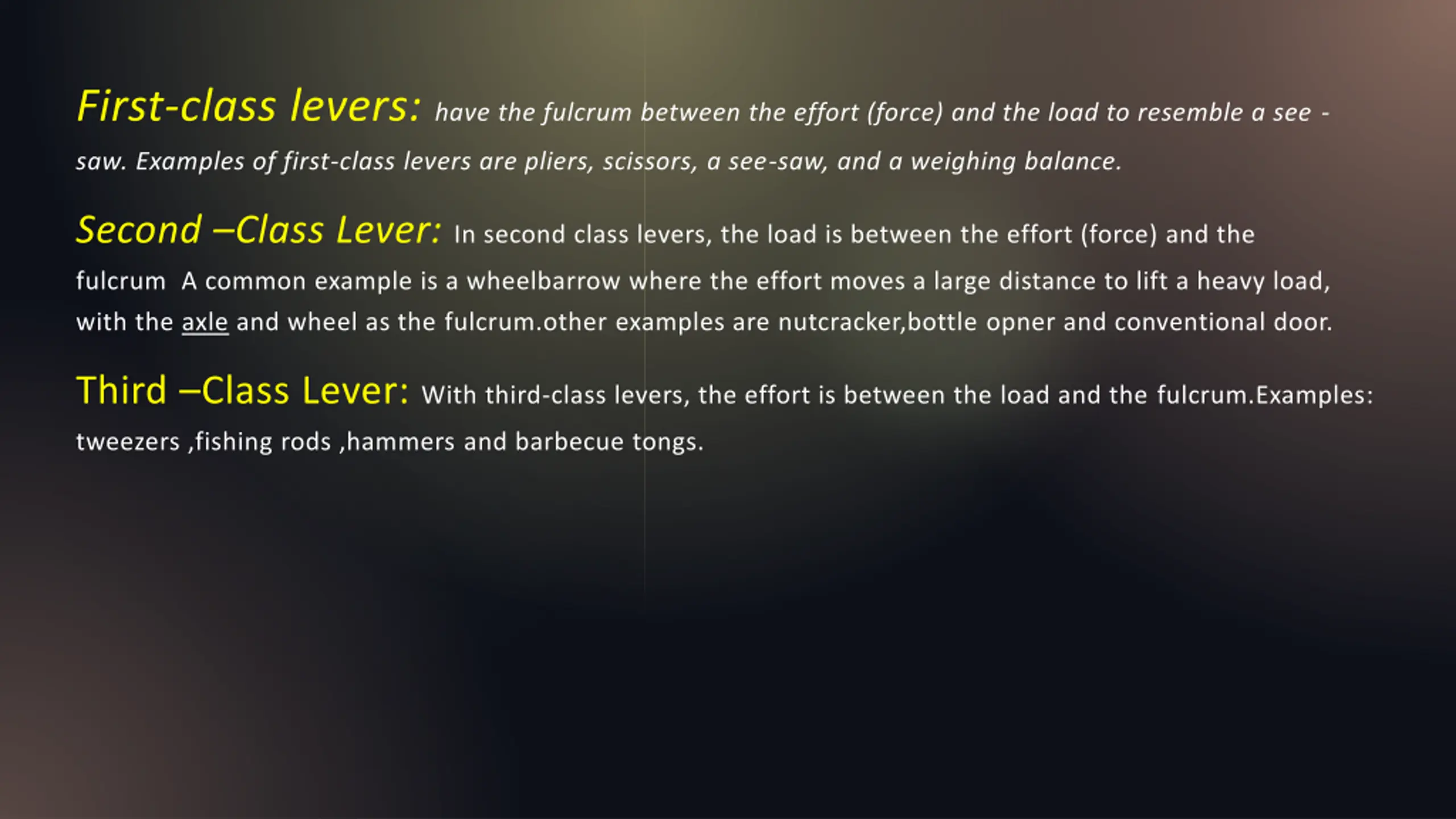 First-class levers: have the fulcrum between the effort (force) and the load to resemble a see - saw. Examples of first-class levers are pliers, scissors, a see-saw, and a weighing balance. Second Class Lever: In second class levers, the load is between the effort (force) and the fulcrum A common example is a wheelbarrow where the effort moves a large distance to lift a heavy load, with the axle and wheel as the fulcrum.other examples are nutcracker,bottle opner and conventional door. Third Class Lever: With third-class levers, the effort is between the load and the fulcrum.Examples: tweezers ,fishing rods ,hammers and barbecue tongs.