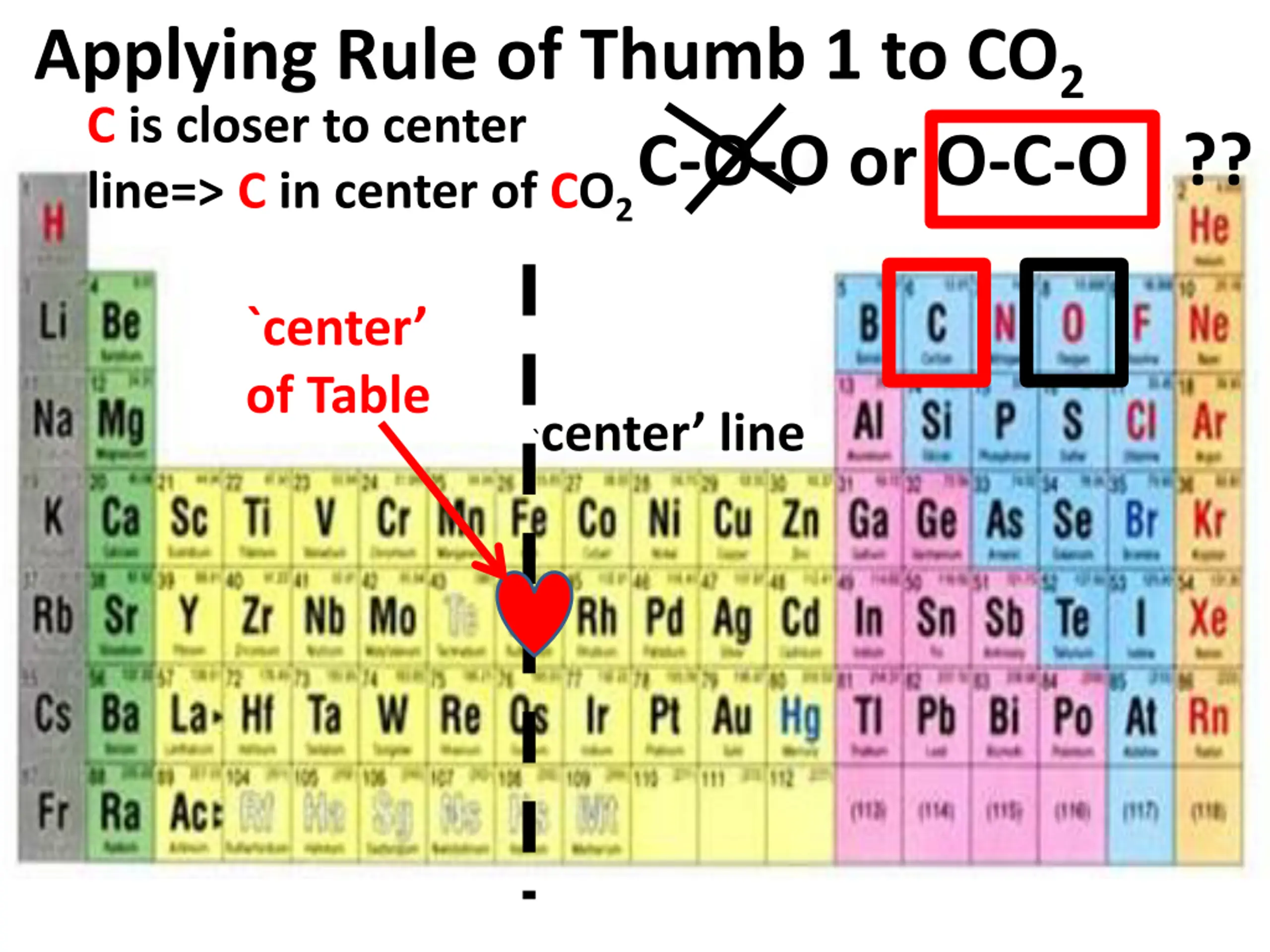 Applying Rule of Thumb 1 to CO2 C is closer to center line=> C in center of CO2C-O-O or O-C-O ?? `center of Table `center line