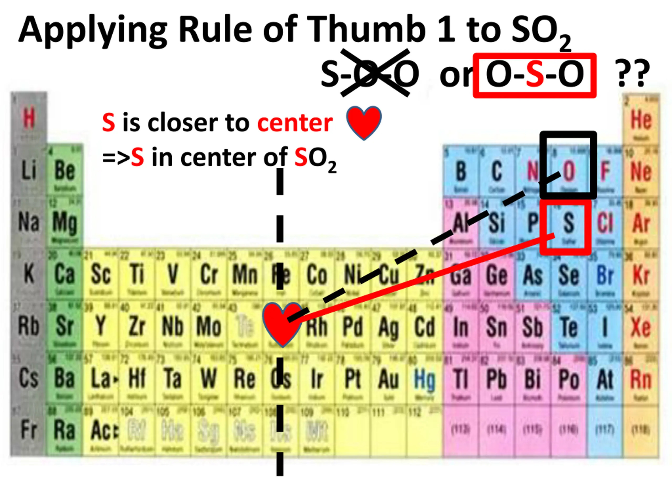 Applying Rule of Thumb 1 to SO2 S-O-O or O-S-O ?? S is closer to center =>S in center of SO2