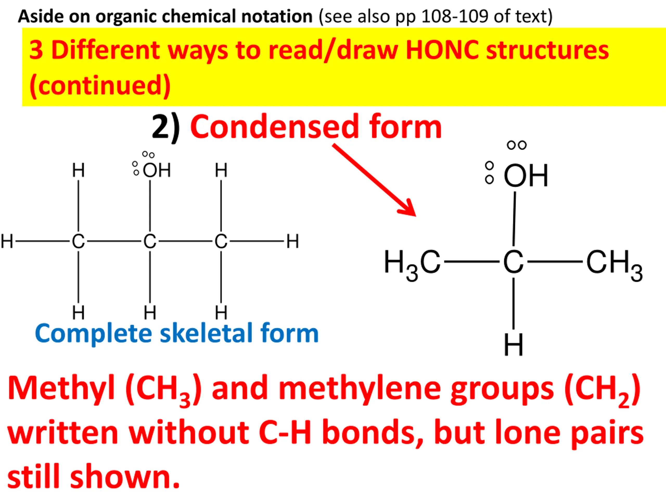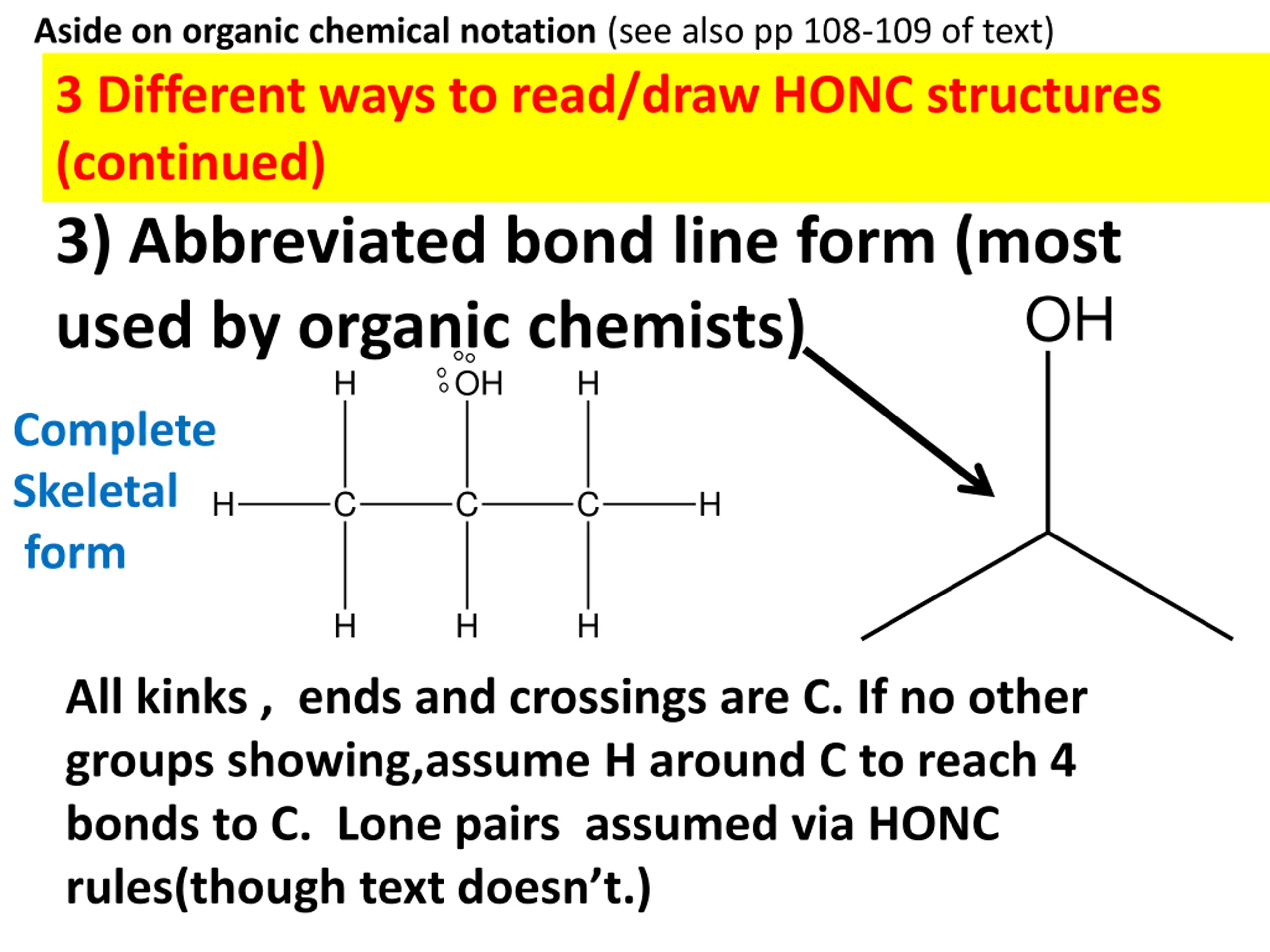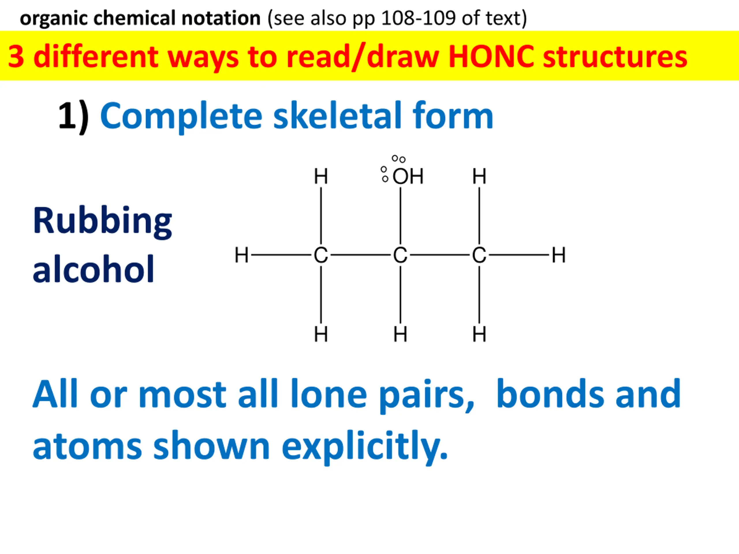organic chemical notation (see also pp 108-109 of text) 3 different ways to read/draw HONC structures 1) Complete skeletal form H OH H Rubbing alcohol H C C C H H H H All or most all lone pairs, bonds and atoms shown explicitly.
