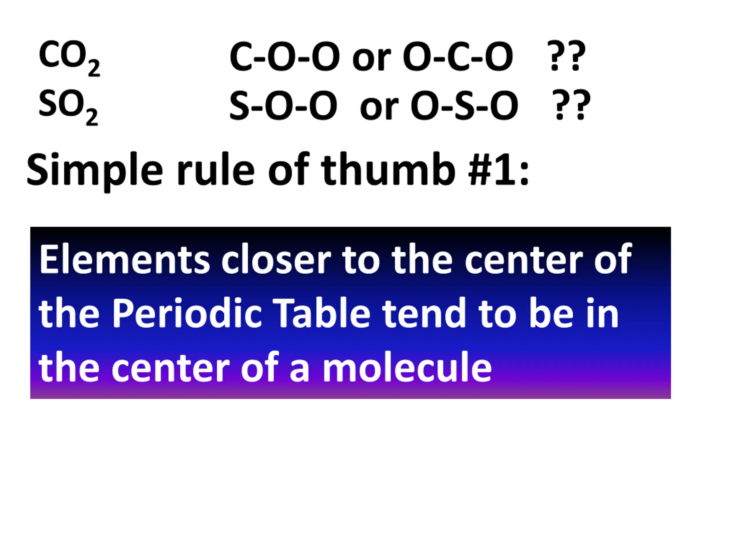 CO2 SO2 C-O-O or O-C-O ?? S-O-O or O-S-O ?? Simple rule of thumb #1: Elements closer to the center of the Periodic Table tend to be in the center of a molecule