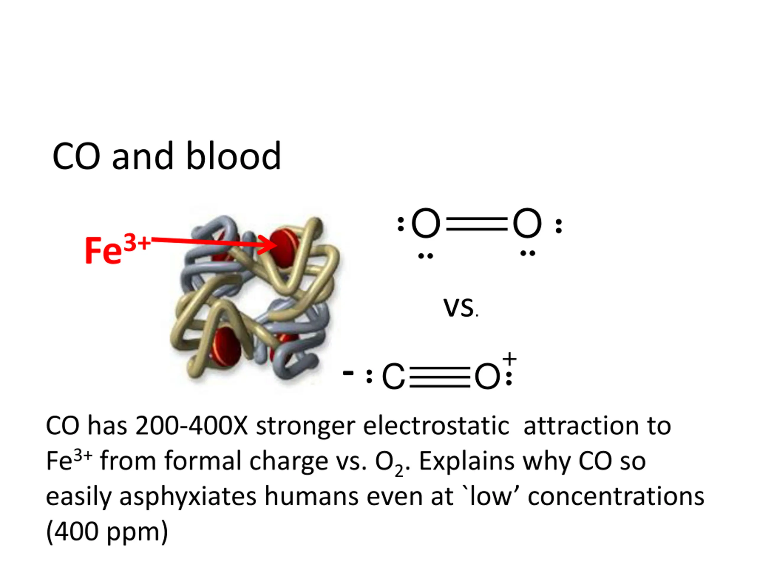CO and blood http://www.glycemicindex.com/blog/february2007/heme_iron176.jpg O O Fe3+ vs. O+ - C CO has 200-400X stronger electrostatic attraction to Fe3+ from formal charge vs. O2. Explains why CO so easily asphyxiates humans even at `low concentrations (400 ppm)