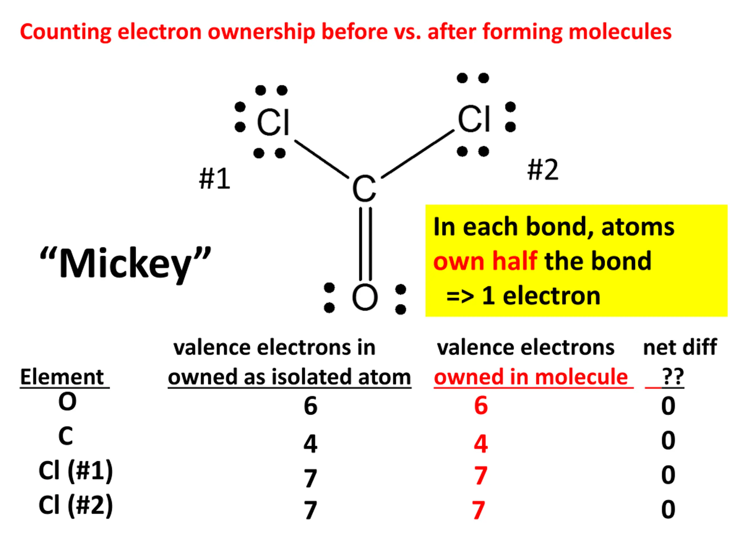 Counting electron ownership before vs. after forming molecules #2 #1 In each bond, atoms own half the bond => 1 electron Mickey valence electrons in valence electrons net diff owned as isolated atom owned in molecule 6 4 7 7 Element ?? 0 0 0 0 O 6 4 7 7 C Cl (#1) Cl (#2)