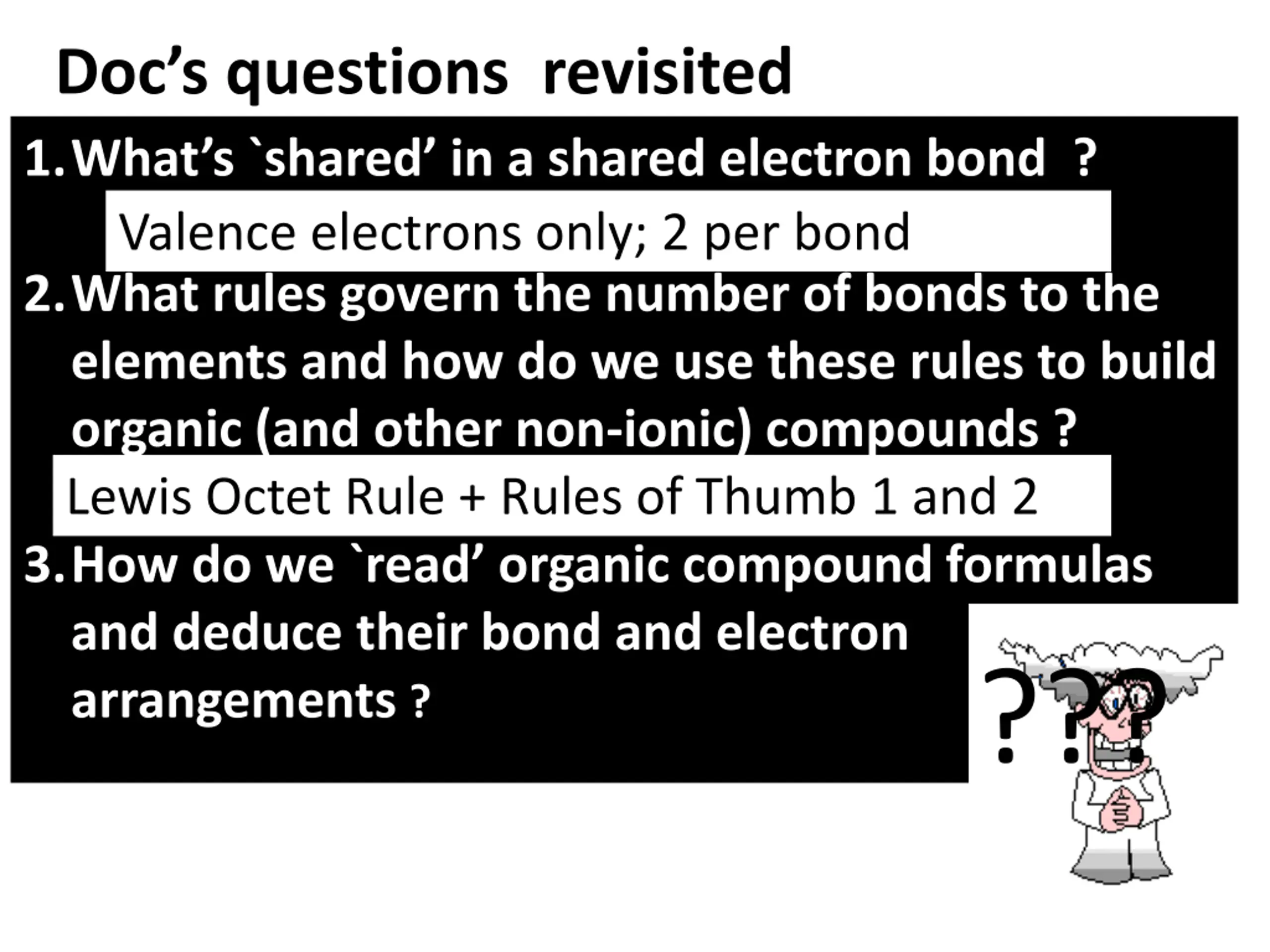 Docs questions revisited 1.What s `shared in a shared electron bond ? Valence electrons only; 2 per bond 2.What rules govern the number of bonds to the elements and how do we use these rules to build organic (and other non-ionic) compounds ? Lewis Octet Rule + Rules of Thumb 1 and 2 3.How do we `read organic compound formulas and deduce their bond and electron arrangements ? ???