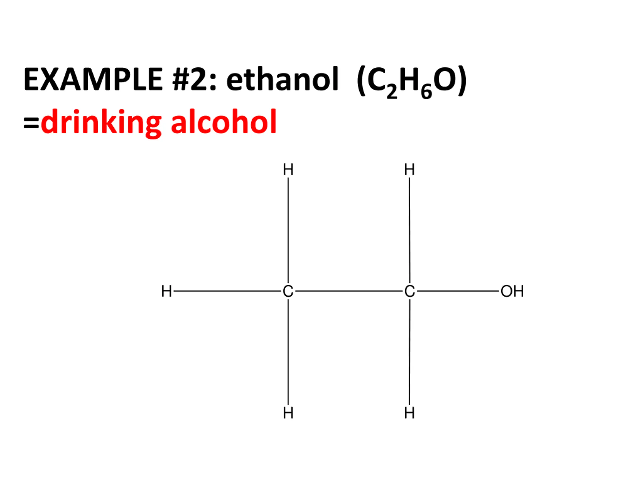 EXAMPLE #2: ethanol (C2H6O) =drinking alcohol H H H C C OH H H