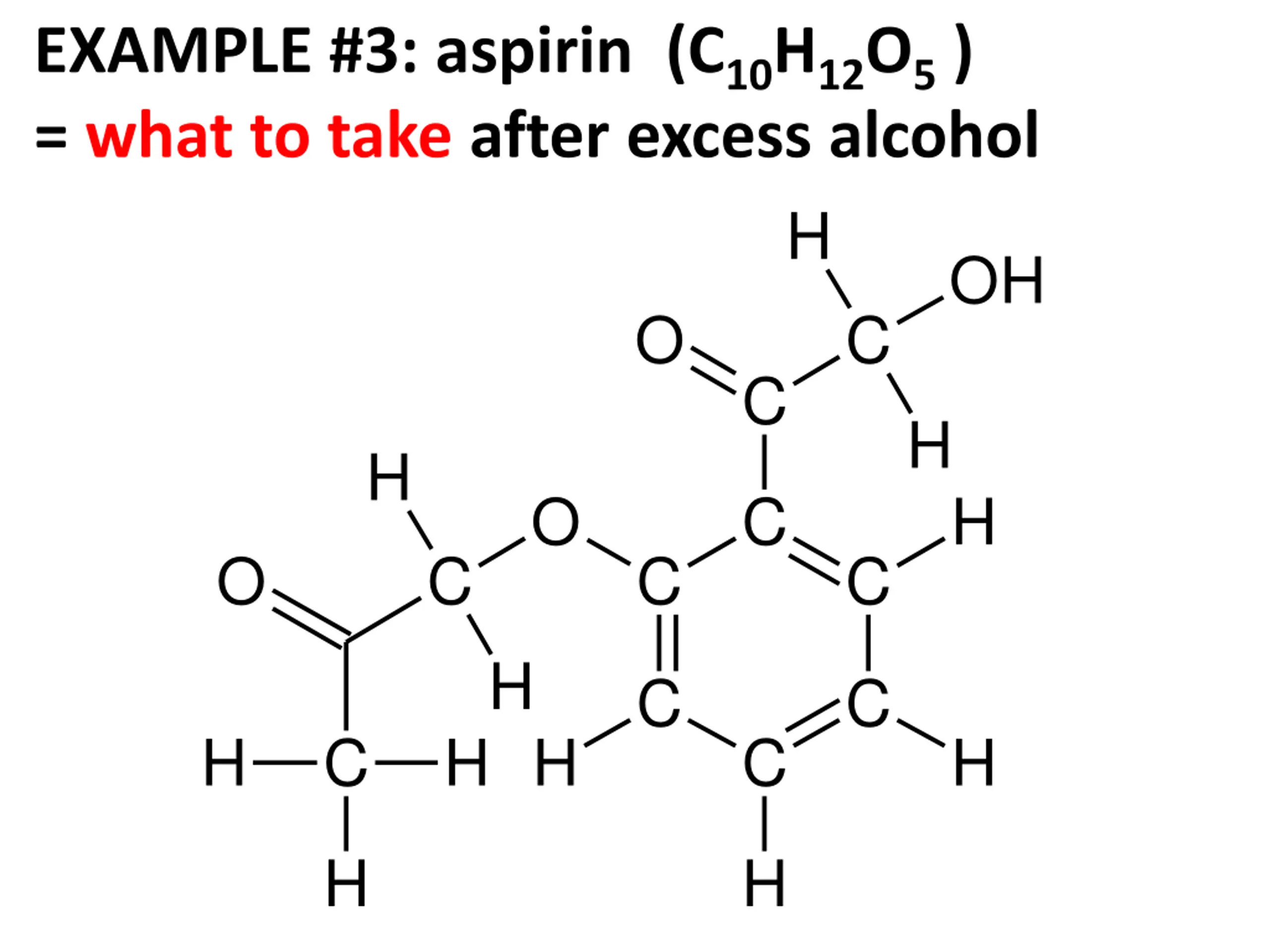 EXAMPLE #3: aspirin (C10H12O5 ) = what to take after excess alcohol H OH O C C H H O C H O C C C H C C H C H H C H H H