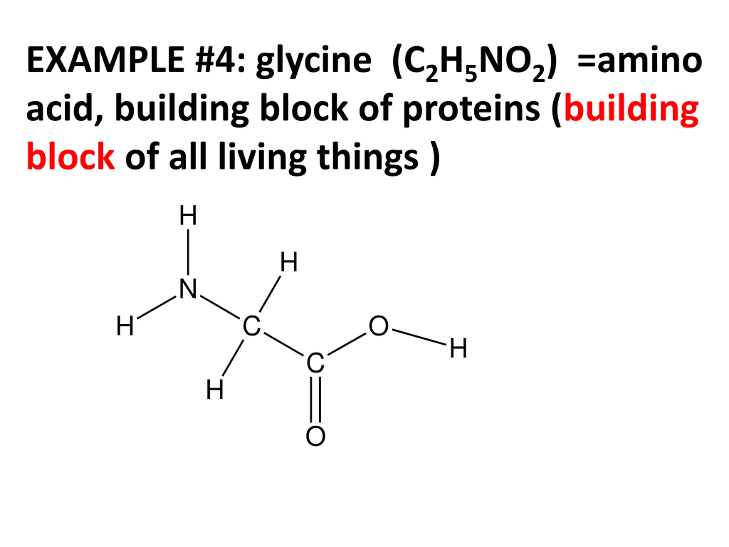 EXAMPLE #4: glycine (C2H5NO2) =amino acid, building block of proteins (building block of all living things ) H H N H C O H C H O
