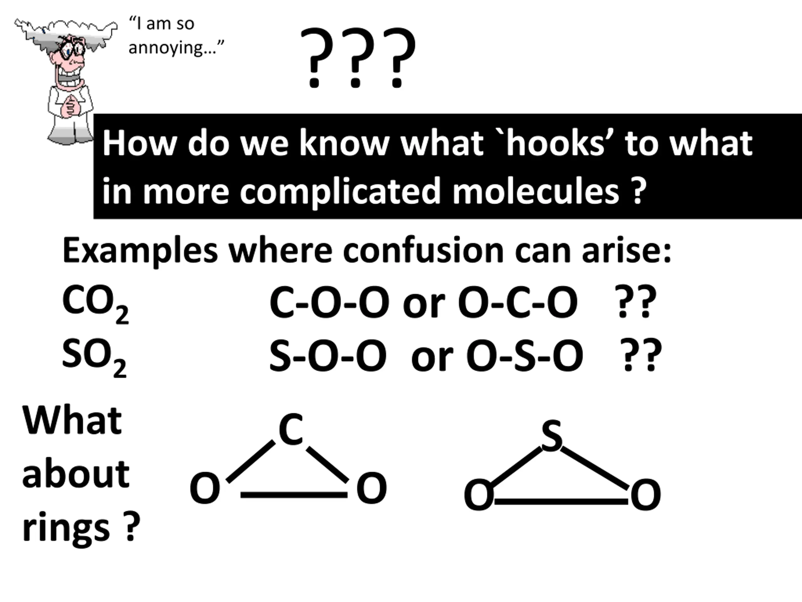 I am so annoying ??? How do we know what `hooks to what in more complicated molecules ? Examples where confusion can arise: CO2 C-O-O or O-C-O ?? SO2 S-O-O or O-S-O ?? C O O about rings ? What S O O