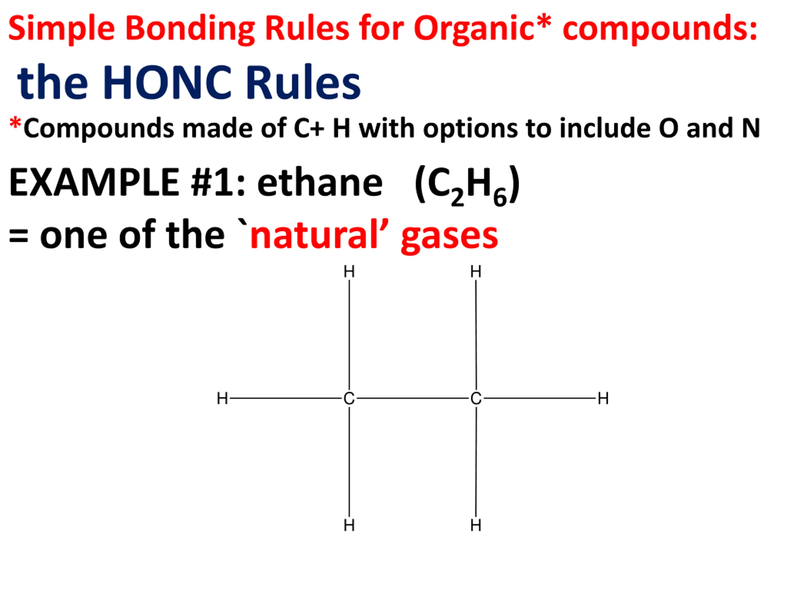 Simple Bonding Rules for Organic* compounds: the HONC Rules *Compounds made of C+ H with options to include O and N EXAMPLE #1: ethane (C2H6) = one of the `natural gases H H H C C H H H