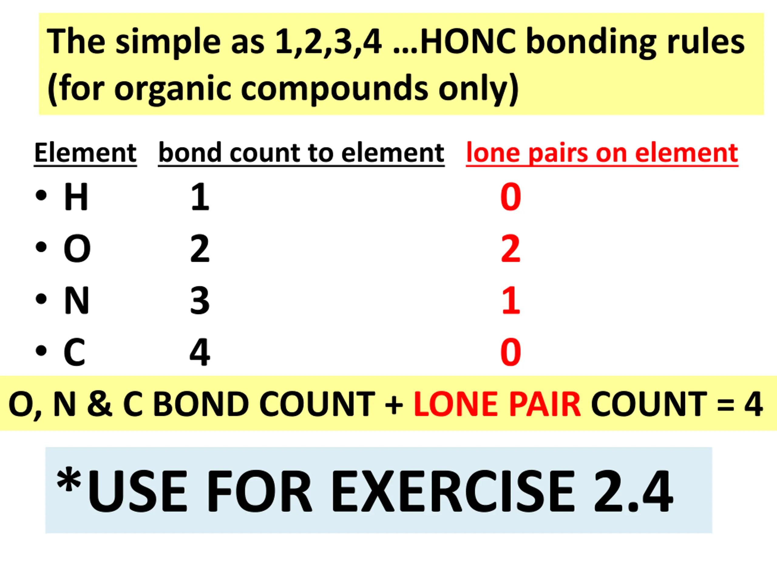 The simple as 1,2,3,4 HONC bonding rules (for organic compounds only) Element bond count to element lone pairs on element H 1 O 2 N 3 C 4 O, N & C BOND COUNT + LONE PAIR COUNT = 4 0 2 1 0 *USE FOR EXERCISE 2.4