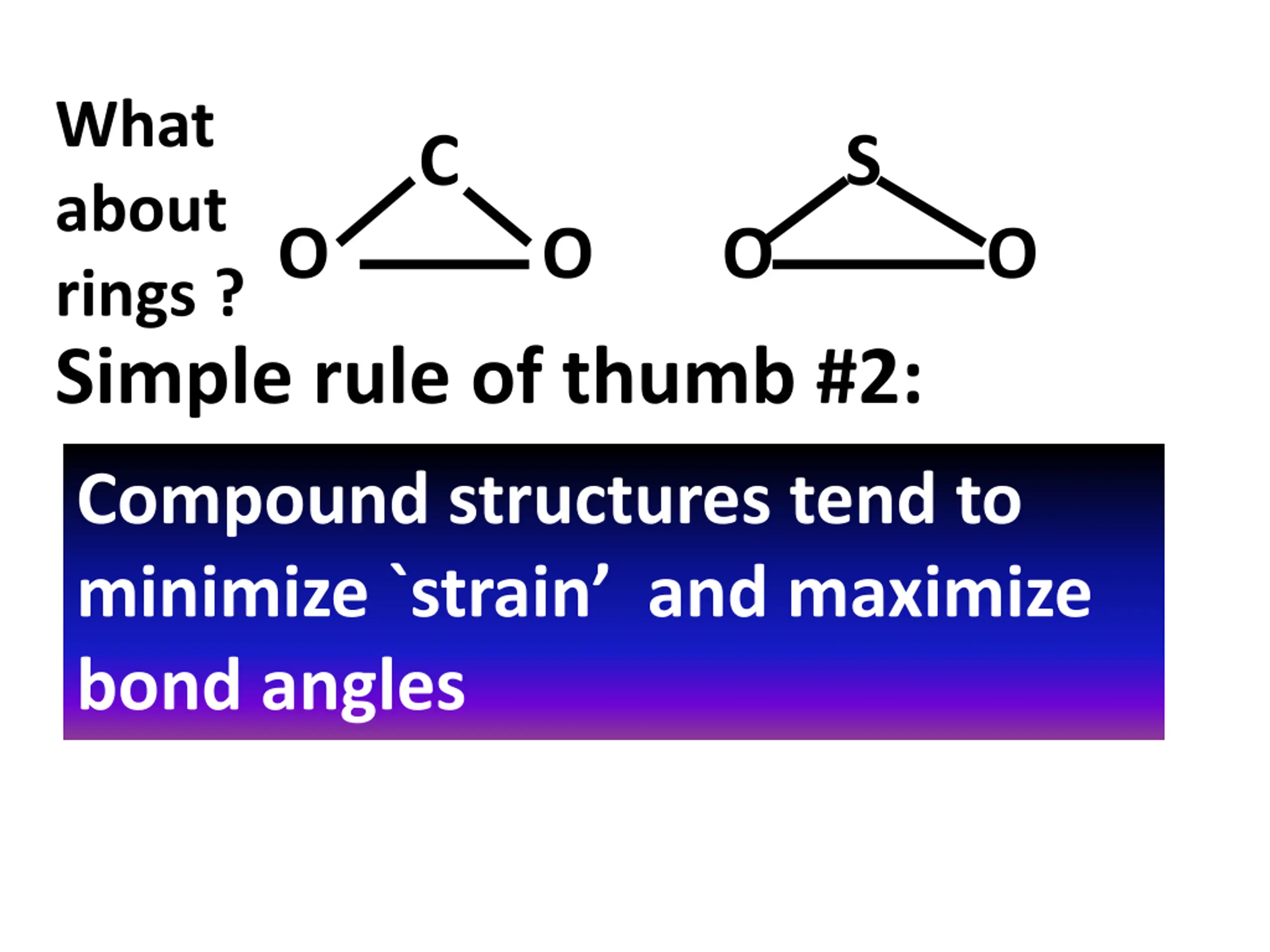 What about rings ? Simple rule of thumb #2: C S O O O O Compound structures tend to minimize `strain and maximize bond angles