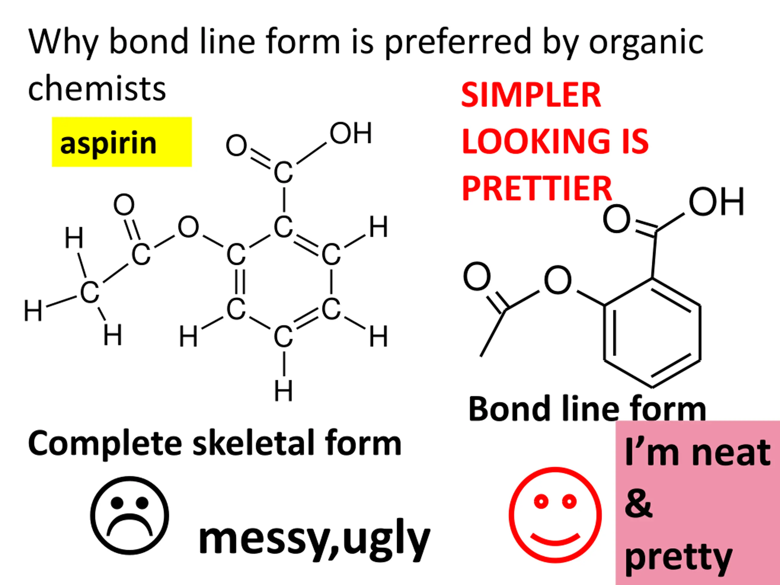 Why bond line form is preferred by organic chemists SIMPLER LOOKING IS PRETTIER OH aspirin O C OH O O O C H H C C C O O C C C H H H C H H Bond line form Complete skeletal form messy,ugly I m neat & pretty