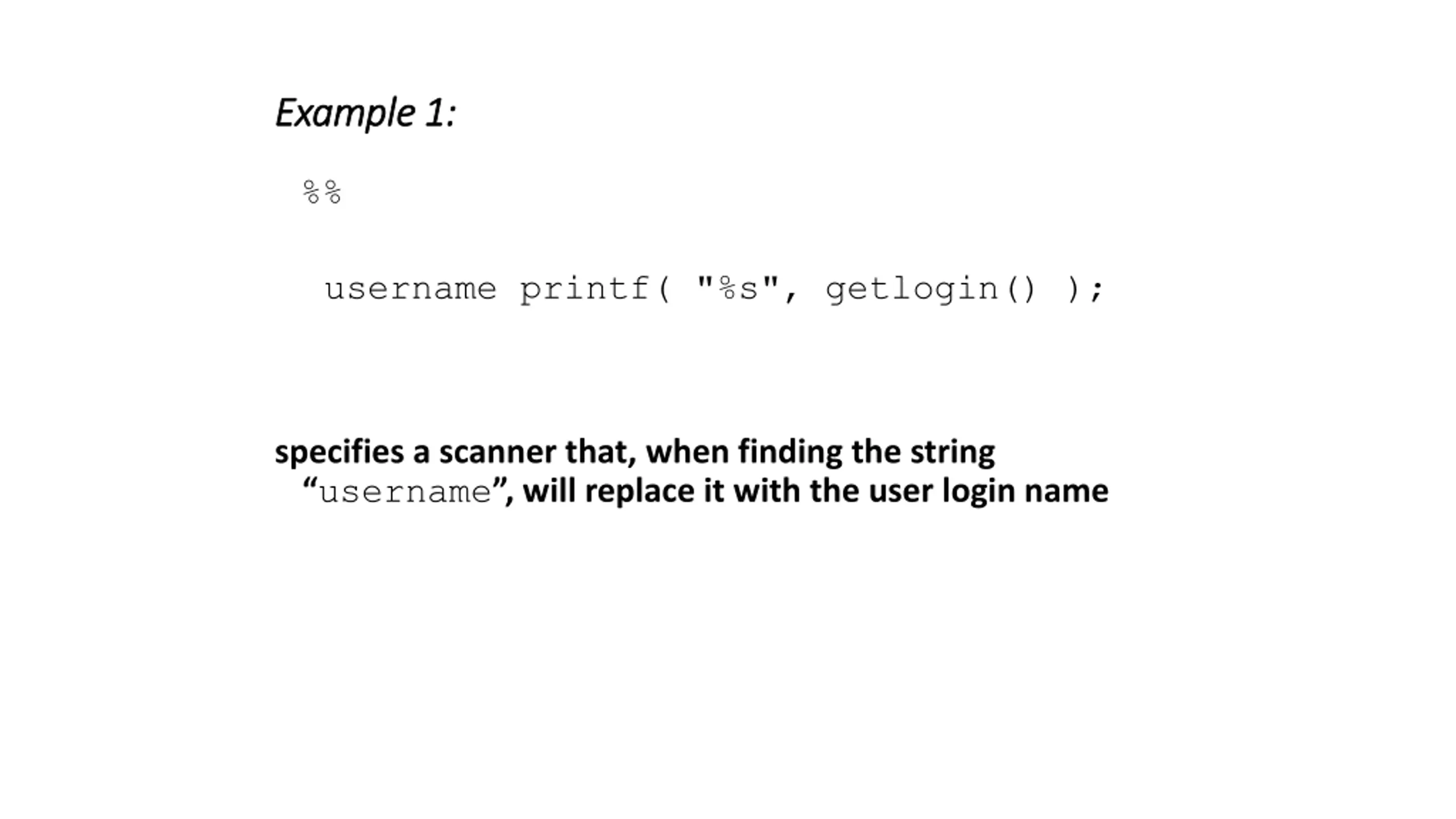 Example 1: Example 1: %% username printf( "%s", getlogin() ); specifies a scanner that, when finding the string username , will replace it with the user login name