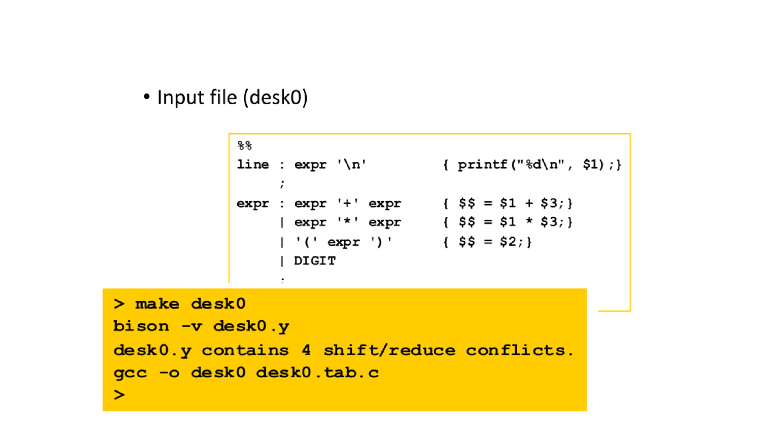 Conflict resolution in yacc Conflict shift-reduce prefer shift Conflict reduce-reduce chose first production