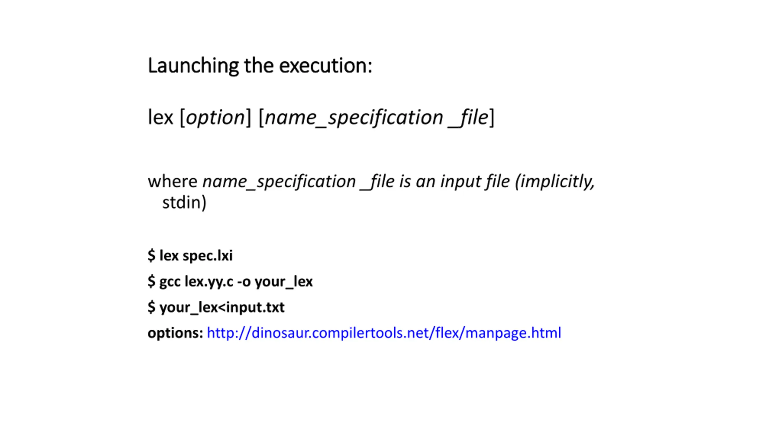 Launching the execution: Launching the execution: lex [option] [name_specification _file] where name_specification _file is an input file (implicitly, stdin) $ lex spec.lxi $ gcc lex.yy.c -o your_lex $ your_lex<input.txt options: http://dinosaur.compilertools.net/flex/manpage.html