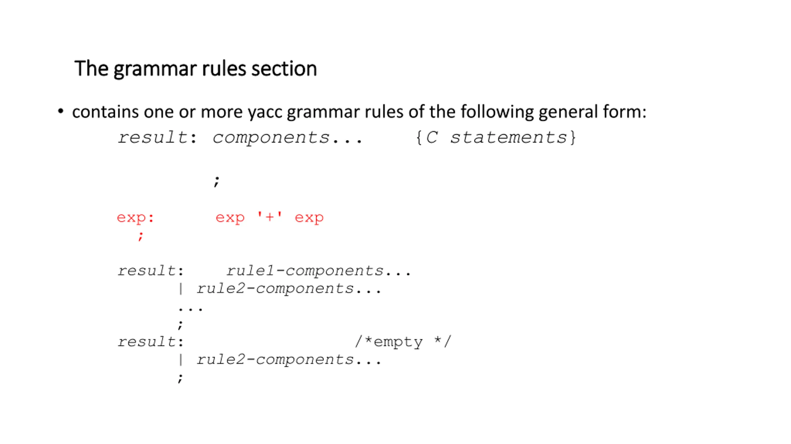 The grammar rules section The grammar rules section contains one or more yacc grammar rules of the following general form: result: components... {C statements} ; ; exp: exp '+' exp result: rule1-components... | rule2-components... ... ; result: | rule2-components... ; /*empty */