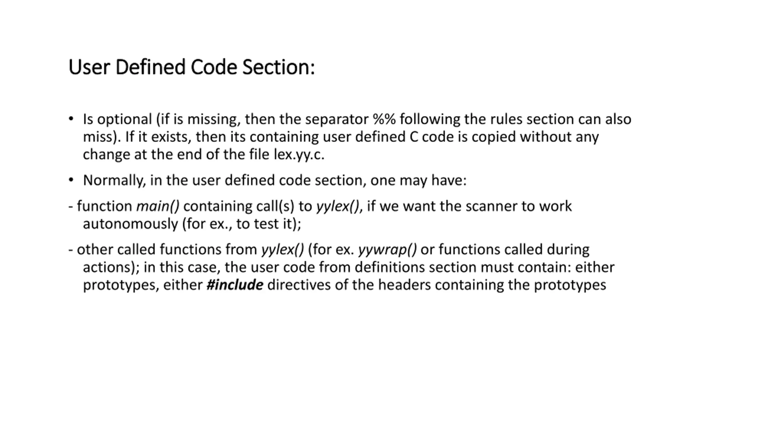 User Defined Code Section: User Defined Code Section: Is optional (if is missing, then the separator %% following the rules section can also miss). If it exists, then its containing user defined C code is copied without any change at the end of the file lex.yy.c. Normally, in the user defined code section, one may have: - function main() containing call(s) to yylex(), if we want the scanner to work autonomously (for ex., to test it); - other called functions from yylex() (for ex. yywrap() or functions called during actions); in this case, the user code from definitions section must contain: either prototypes, either #include directives of the headers containing the prototypes