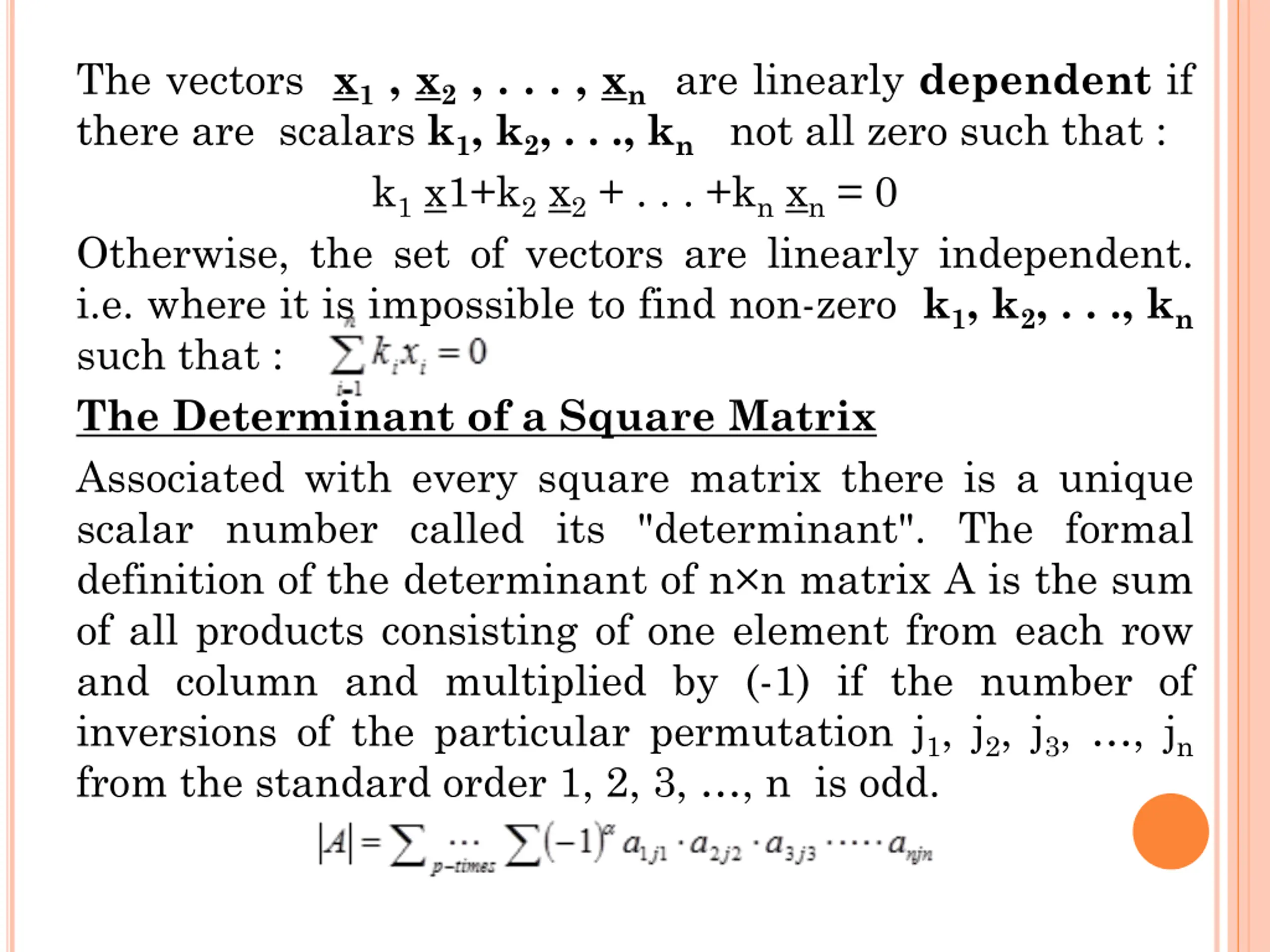 The vectors x1, x2, . . . , xnare linearly dependent if there are scalars k1, k2, . . ., kn not all zero such that : k1x1+k2x2+ . . . +knxn= 0 Otherwise, the set of vectors are linearly independent. i.e. where it is impossible to find non-zero k1, k2, . . ., kn such that : The Determinant of a Square Matrix Associated with every square matrix there is a unique scalar number called its "determinant". The formal definition of the determinant of n n matrix A is the sum of all products consisting of one element from each row and column and multiplied by (-1) if the number of inversions of the particular permutation j1, j2, j3, , jn from the standard order 1, 2, 3, , n is odd.