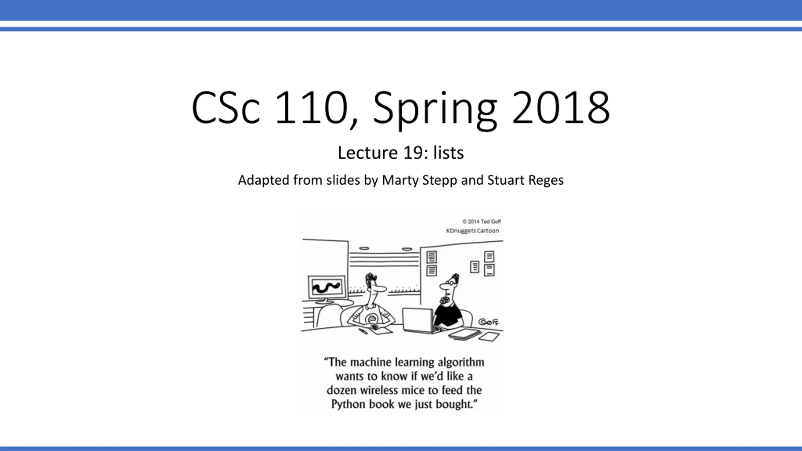 CSc 110, Spring 2018 Lecture 19: lists Adapted from slides by Marty Stepp and Stuart Reges