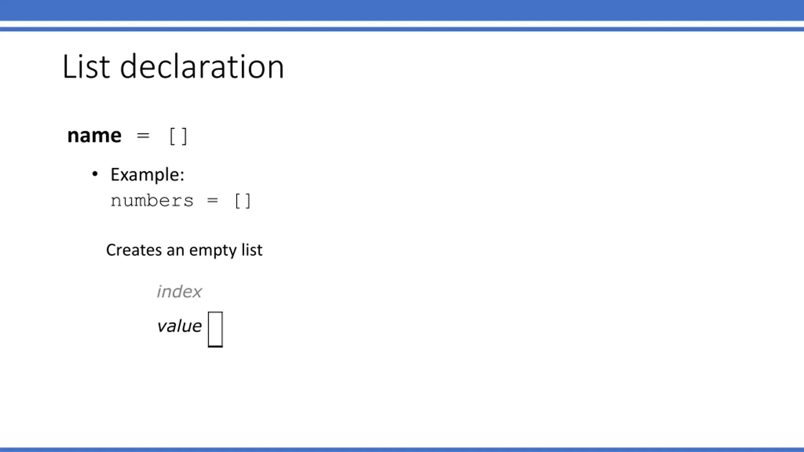 List declaration name = [] Example: numbers = [] Creates an empty list index value