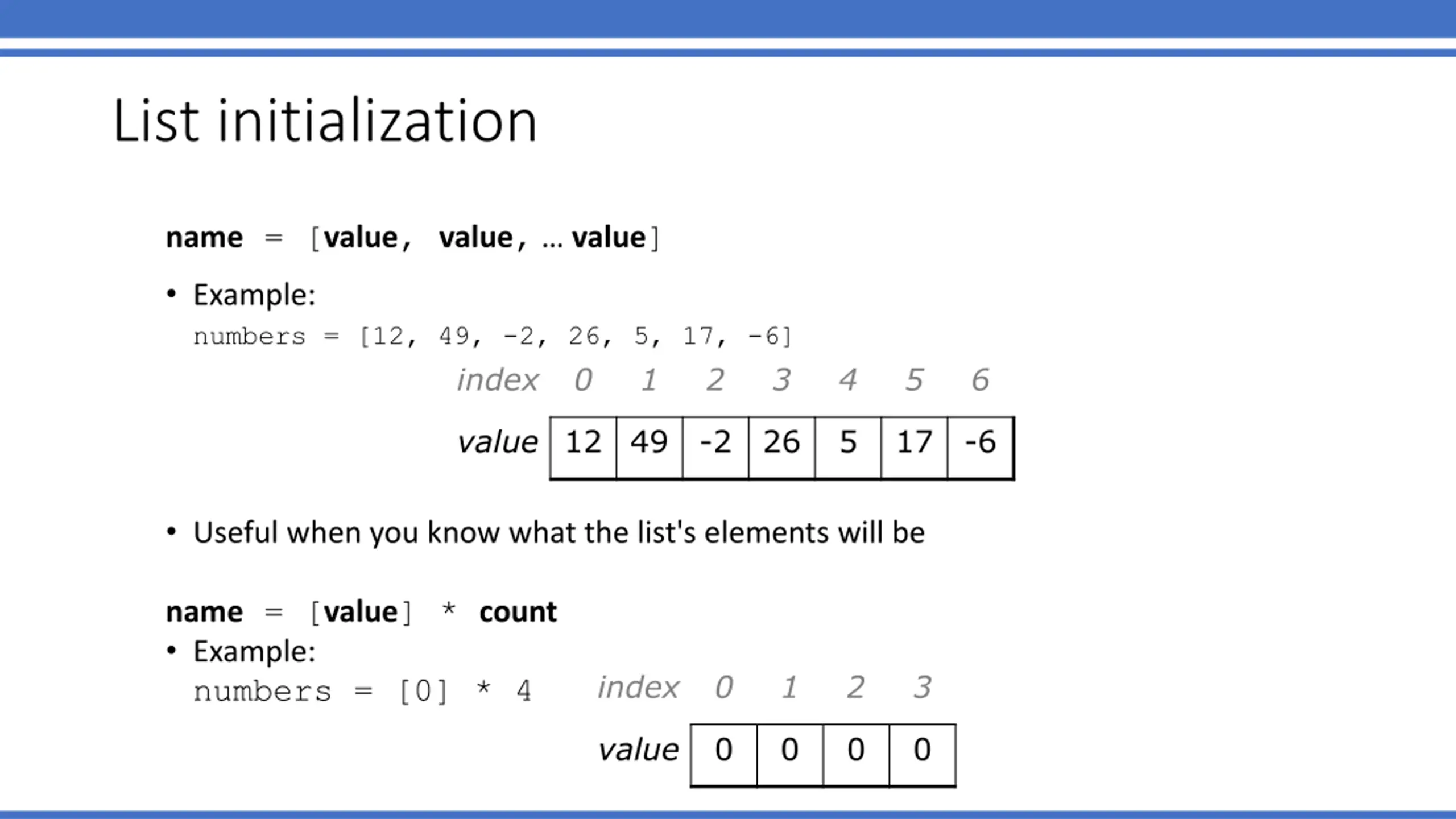 List initialization name = [value, value, value] Example: numbers = [12, 49, -2, 26, 5, 17, -6] index 0 1 2 3 4 5 6 value 12 49 -2 26 5 17 -6 Useful when you know what the list's elements will be name = [value] * count Example: numbers = [0] * 4 index 0 1 2 3 value 0 0 0 0