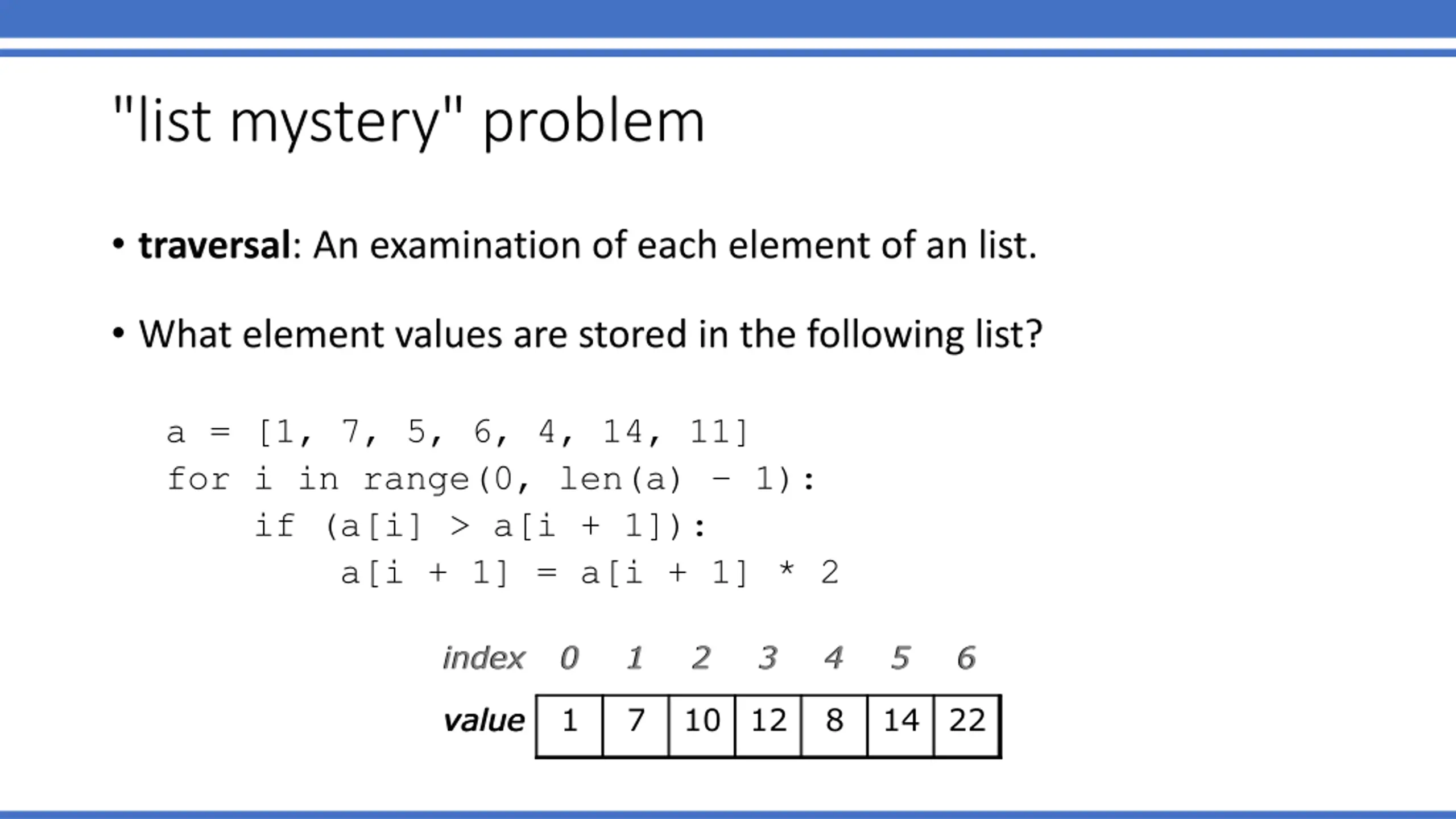 "list mystery" problem traversal: An examination of each element of an list. What element values are stored in the following list? a = [1, 7, 5, 6, 4, 14, 11] for i in range(0, len(a) 1): if (a[i] > a[i + 1]): a[i + 1] = a[i + 1] * 2 index index 0 0 1 1 2 2 3 3 4 4 5 5 6 6 value value 1 7 10 12 8 14 22