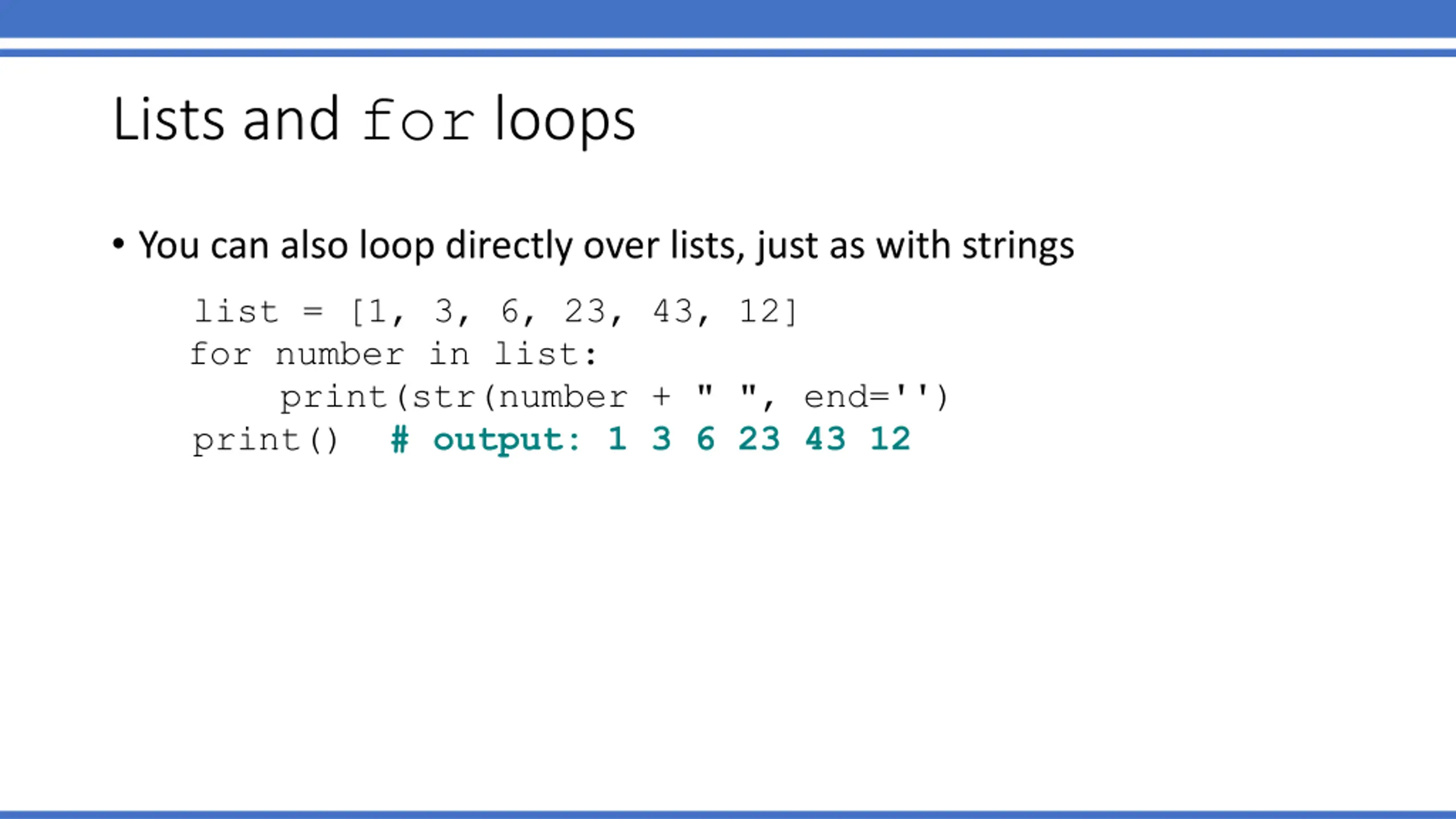 Lists and for loops You can also loop directly over lists, just as with strings list = [1, 3, 6, 23, 43, 12] for number in list: print(str(number + " ", end='') print() # output: 1 3 6 23 43 12