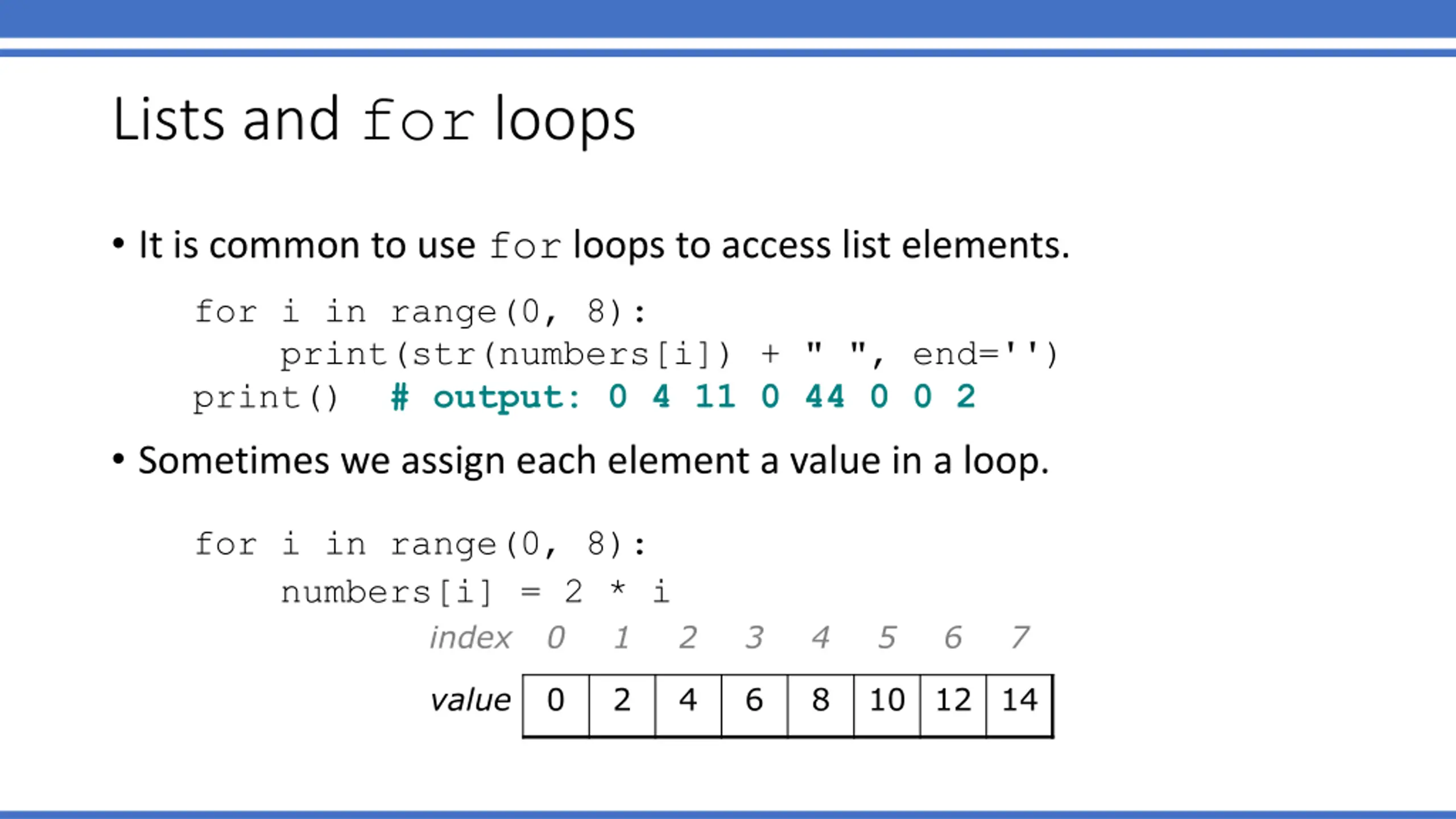 Lists and for loops It is common to use for loops to access list elements. for i in range(0, 8): print(str(numbers[i]) + " ", end='') print() # output: 0 4 11 0 44 0 0 2 Sometimes we assign each element a value in a loop. for i in range(0, 8): numbers[i] = 2 * i index 0 1 2 3 4 5 6 7 value 0 2 4 6 8 10 12 14