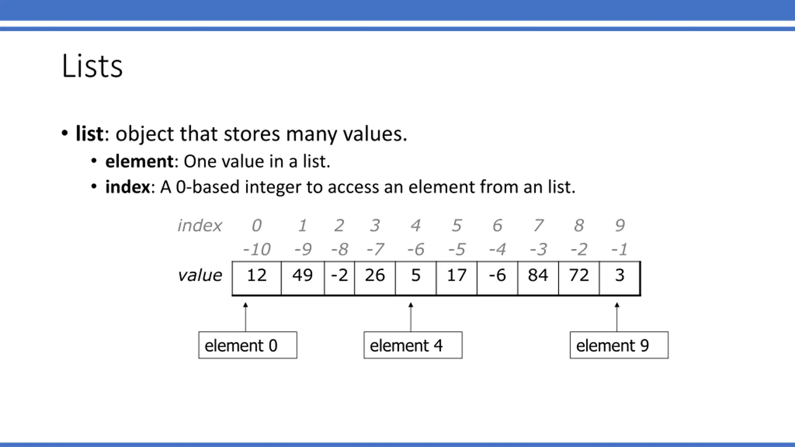 Lists list: object that stores many values. element: One value in a list. index: A 0-based integer to access an element from an list. index 0 1 -9 49 2 -8 -2 3 -7 26 4 -6 5 5 -5 17 6 -4 -6 7 -3 84 8 -2 72 9 -1 3 -10 12 value element 0 element 4 element 9