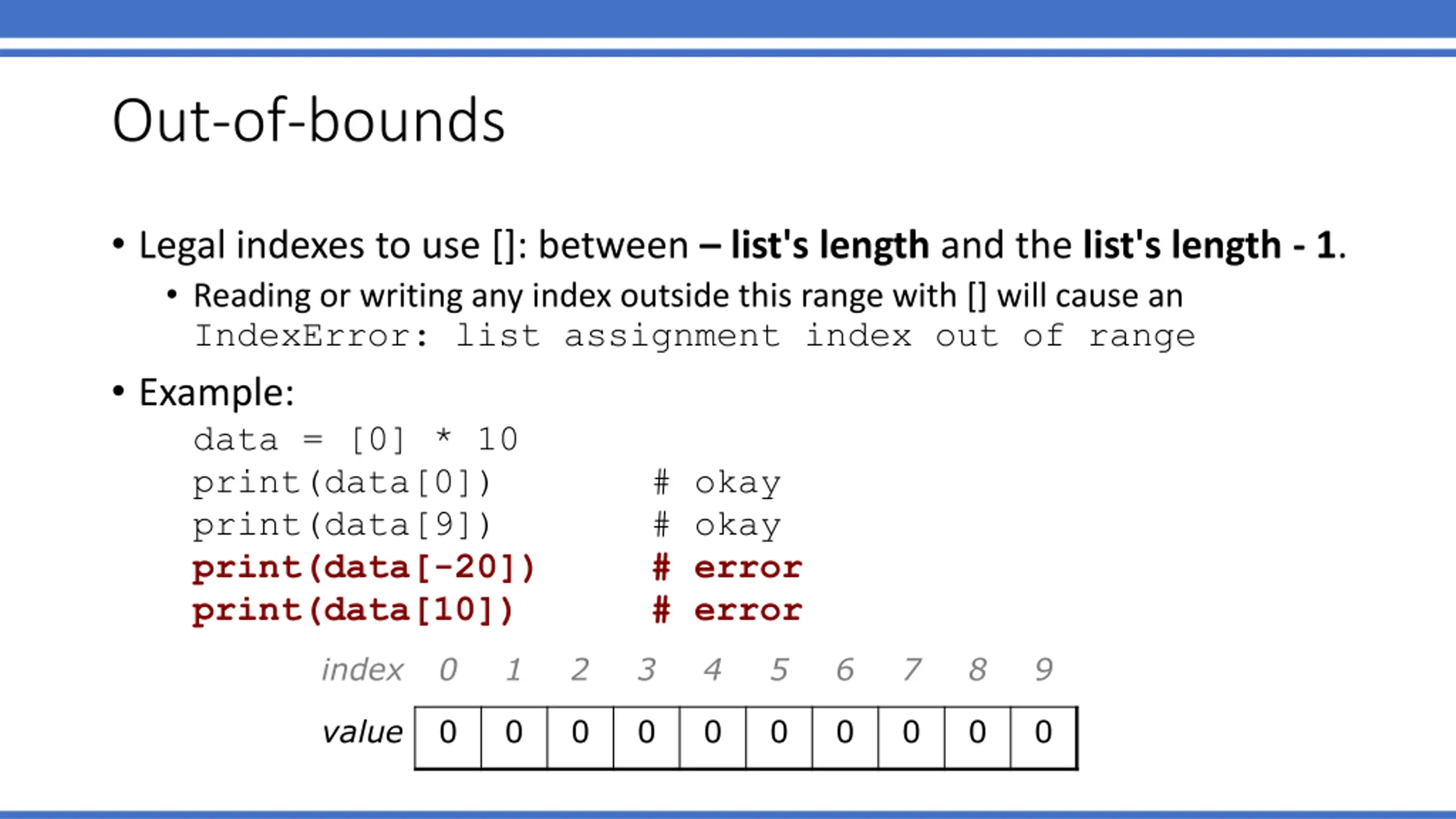Out-of-bounds Legal indexes to use []: between list's length and the list's length - 1. Reading or writing any index outside this range with [] will cause an IndexError: list assignment index out of range Example: data = [0] * 10 print(data[0]) # okay print(data[9]) # okay print(data[-20]) # error print(data[10]) # error index 0 1 2 3 4 5 6 7 8 9 value 0 0 0 0 0 0 0 0 0 0