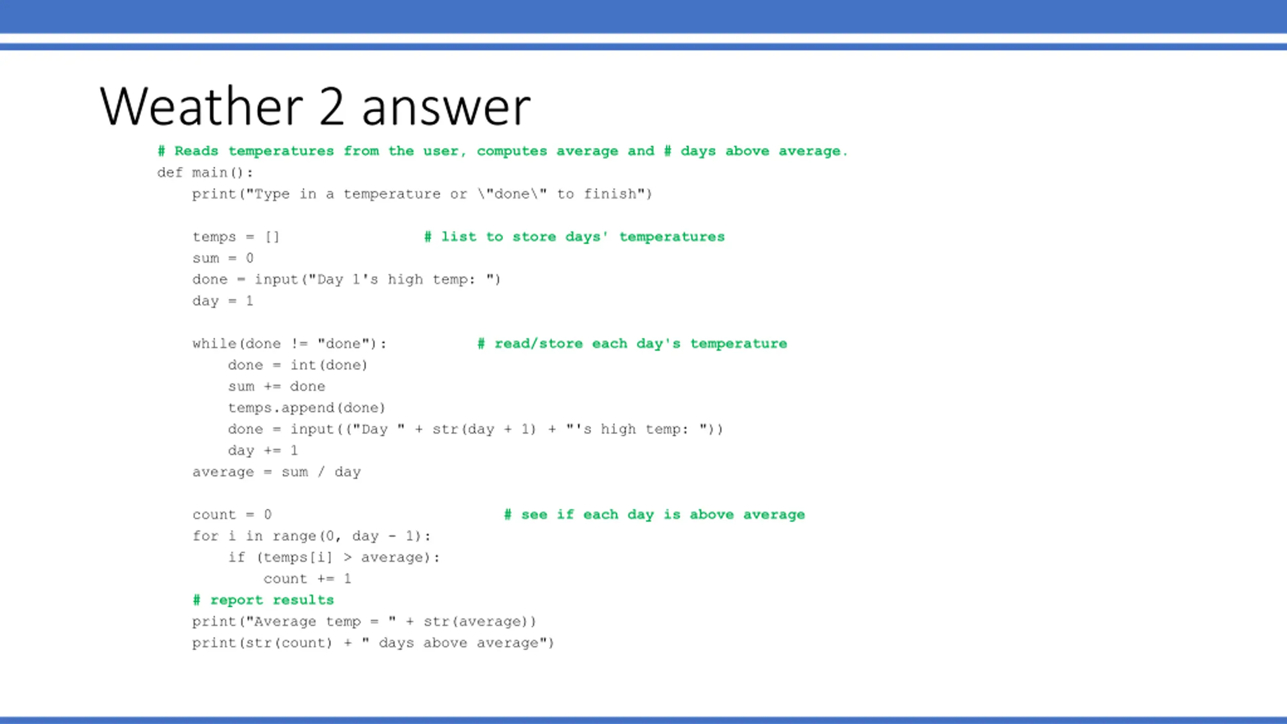 Weather 2 answer # Reads temperatures from the user, computes average and # days above average. def main(): print("Type in a temperature or \"done\" to finish") temps = [] # list to store days' temperatures sum = 0 done = input("Day 1's high temp: ") day = 1 while(done != "done"): # read/store each day's temperature done = int(done) sum += done temps.append(done) done = input(("Day " + str(day + 1) + "'s high temp: ")) day += 1 average = sum / day count = 0 # see if each day is above average for i in range(0, day - 1): if (temps[i] > average): count += 1 # report results print("Average temp = " + str(average)) print(str(count) + " days above average")