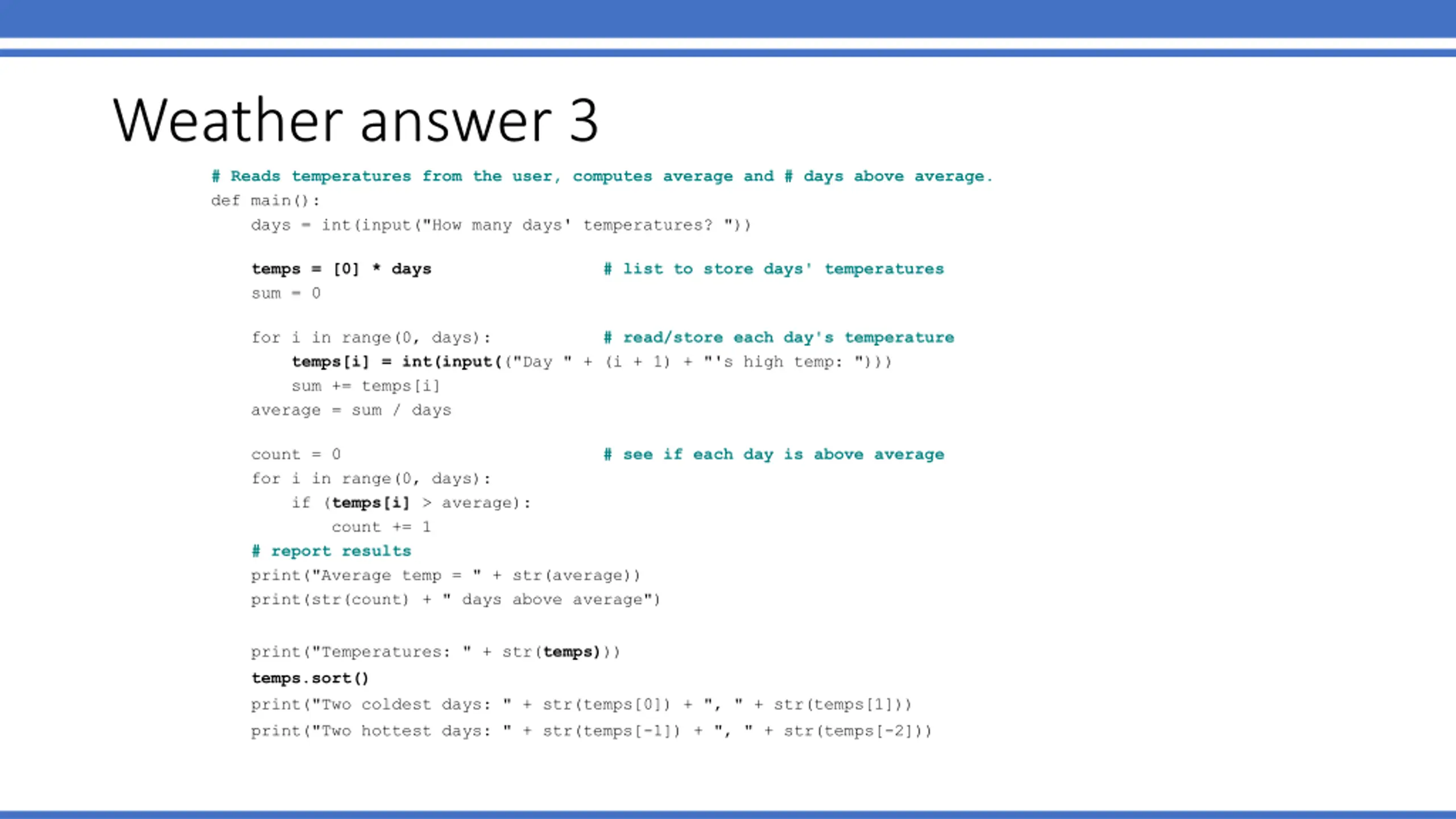 Weather answer 3 # Reads temperatures from the user, computes average and # days above average. def main(): days = int(input("How many days' temperatures? ")) temps = [0] * days # list to store days' temperatures sum = 0 for i in range(0, days): # read/store each day's temperature temps[i] = int(input(("Day " + (i + 1) + "'s high temp: "))) sum += temps[i] average = sum / days count = 0 # see if each day is above average for i in range(0, days): if (temps[i] > average): count += 1 # report results print("Average temp = " + str(average)) print(str(count) + " days above average") print("Temperatures: " + str(temps))) temps.sort() print("Two coldest days: " + str(temps[0]) + ", " + str(temps[1])) print("Two hottest days: " + str(temps[-1]) + ", " + str(temps[-2]))