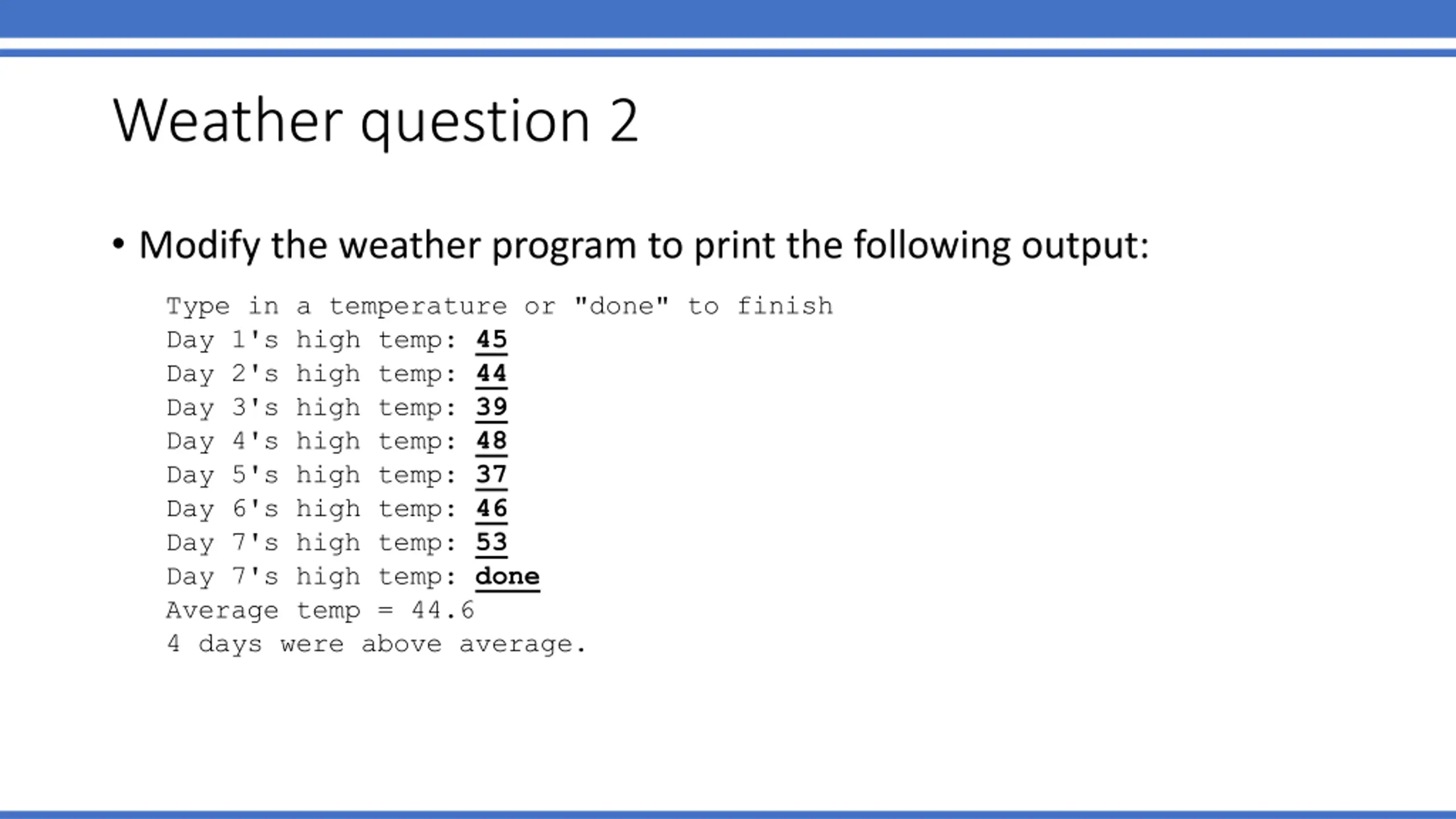 Weather question 2 Modify the weather program to print the following output: Type in a temperature or "done" to finish Day 1's high temp: 45 Day 2's high temp: 44 Day 3's high temp: 39 Day 4's high temp: 48 Day 5's high temp: 37 Day 6's high temp: 46 Day 7's high temp: 53 Day 7's high temp: done Average temp = 44.6 4 days were above average.