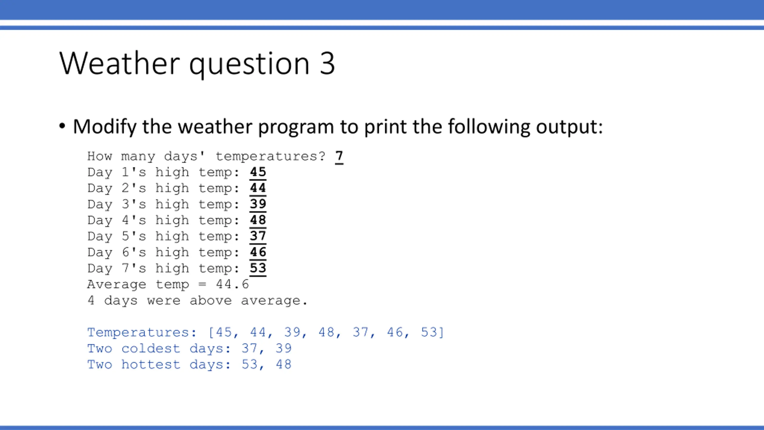 Weather question 3 Modify the weather program to print the following output: How many days' temperatures? 7 Day 1's high temp: 45 Day 2's high temp: 44 Day 3's high temp: 39 Day 4's high temp: 48 Day 5's high temp: 37 Day 6's high temp: 46 Day 7's high temp: 53 Average temp = 44.6 4 days were above average. Temperatures: [45, 44, 39, 48, 37, 46, 53] Two coldest days: 37, 39 Two hottest days: 53, 48