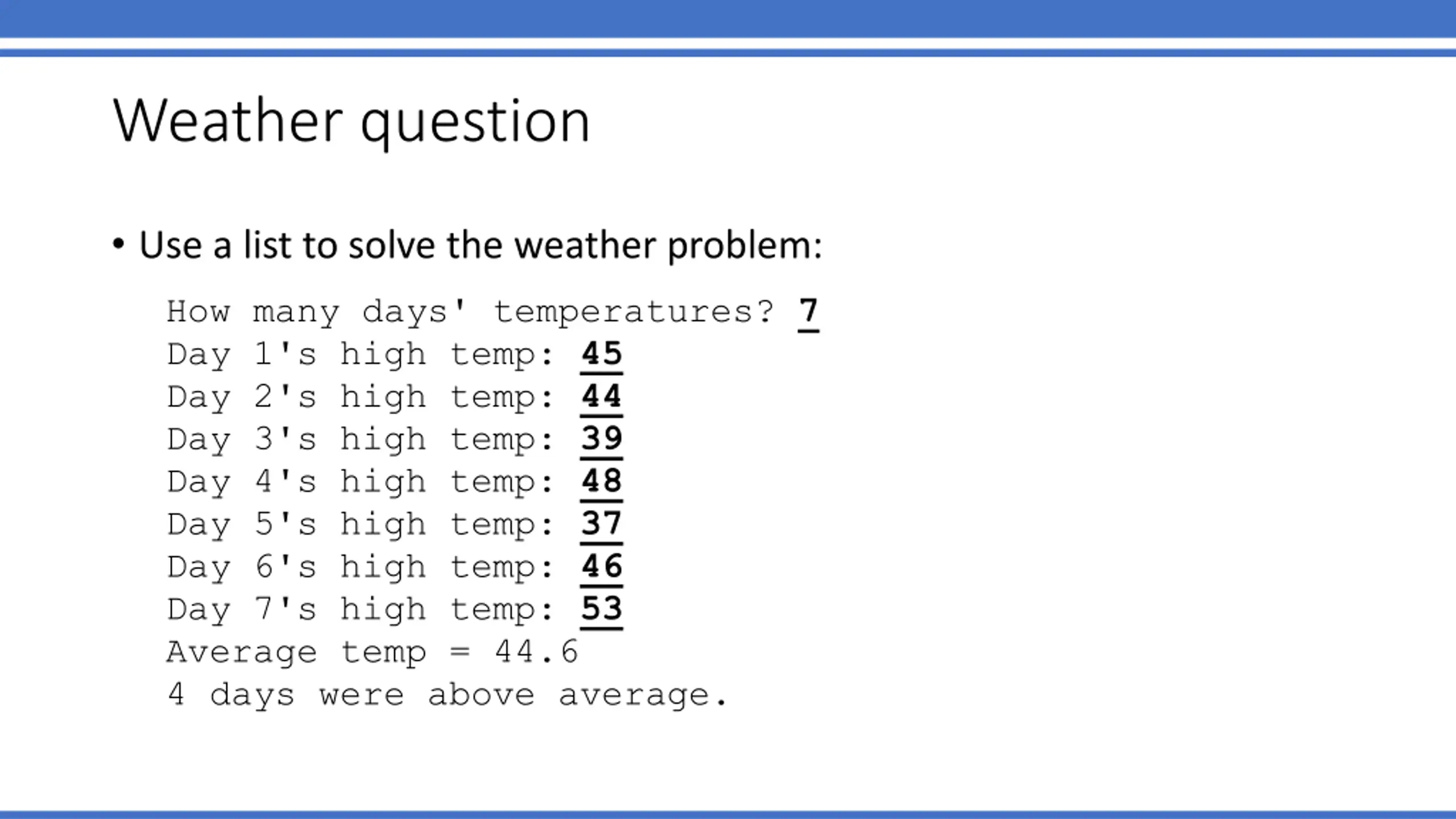 Weather question Use a list to solve the weather problem: How many days' temperatures? 7 Day 1's high temp: 45 Day 2's high temp: 44 Day 3's high temp: 39 Day 4's high temp: 48 Day 5's high temp: 37 Day 6's high temp: 46 Day 7's high temp: 53 Average temp = 44.6 4 days were above average.