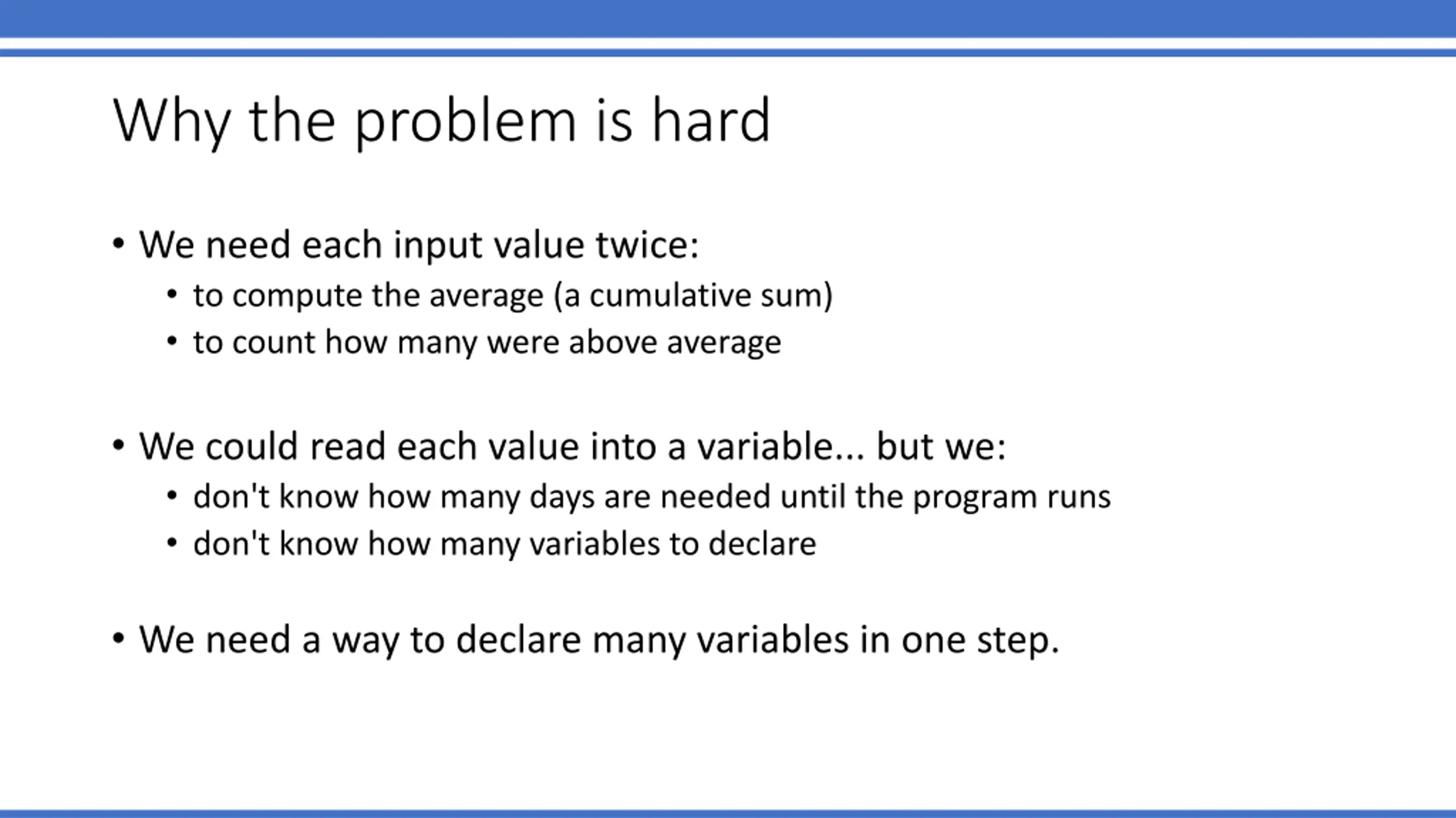 Why the problem is hard We need each input value twice: to compute the average (a cumulative sum) to count how many were above average We could read each value into a variable... but we: don't know how many days are needed until the program runs don't know how many variables to declare We need a way to declare many variables in one step.