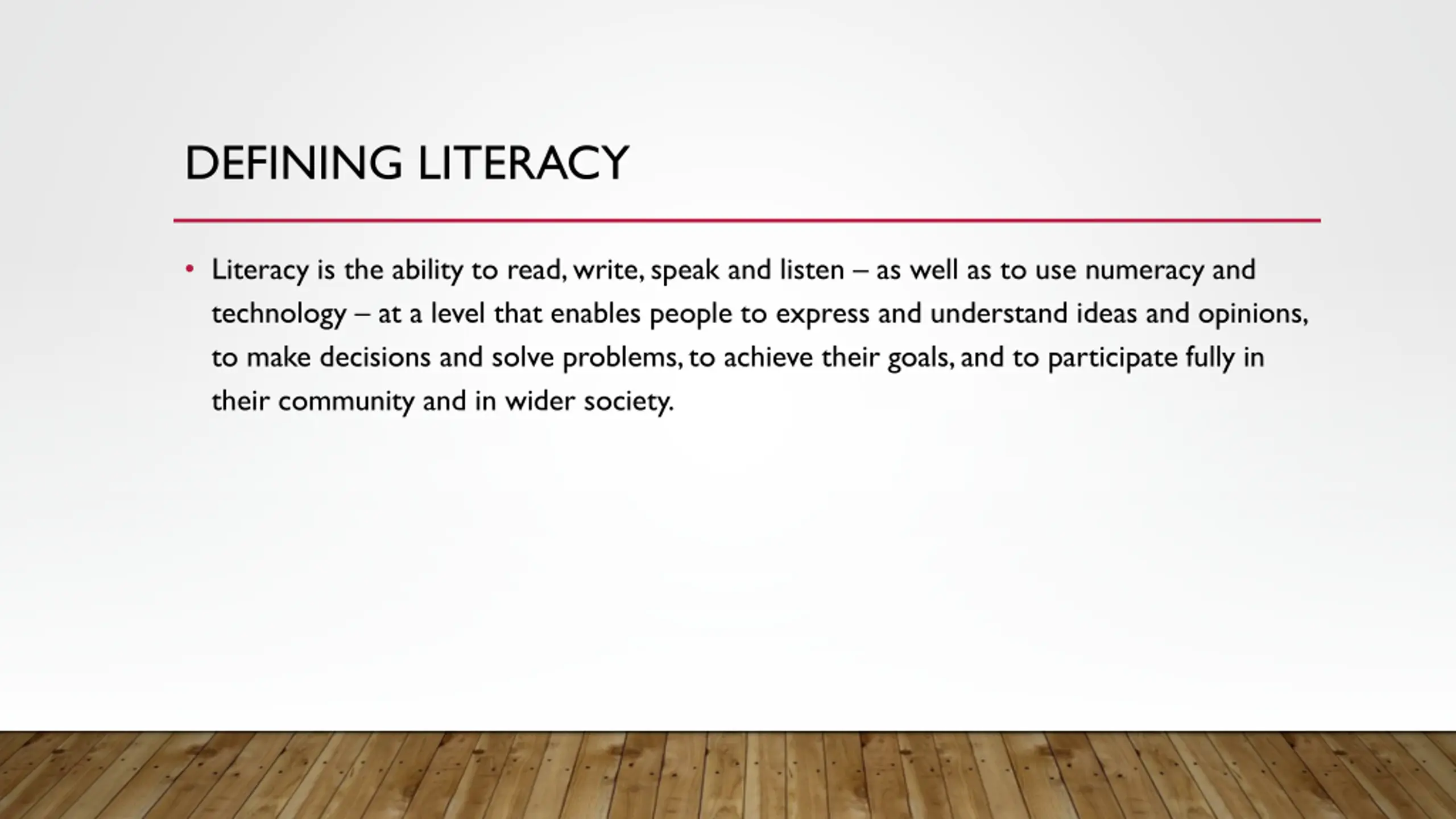 DEFINING LITERACY Literacy is the ability to read, write, speak and listen as well as to use numeracy and technology at a level that enables people to express and understand ideas and opinions, to make decisions and solve problems, to achieve their goals, and to participate fully in their community and in wider society.