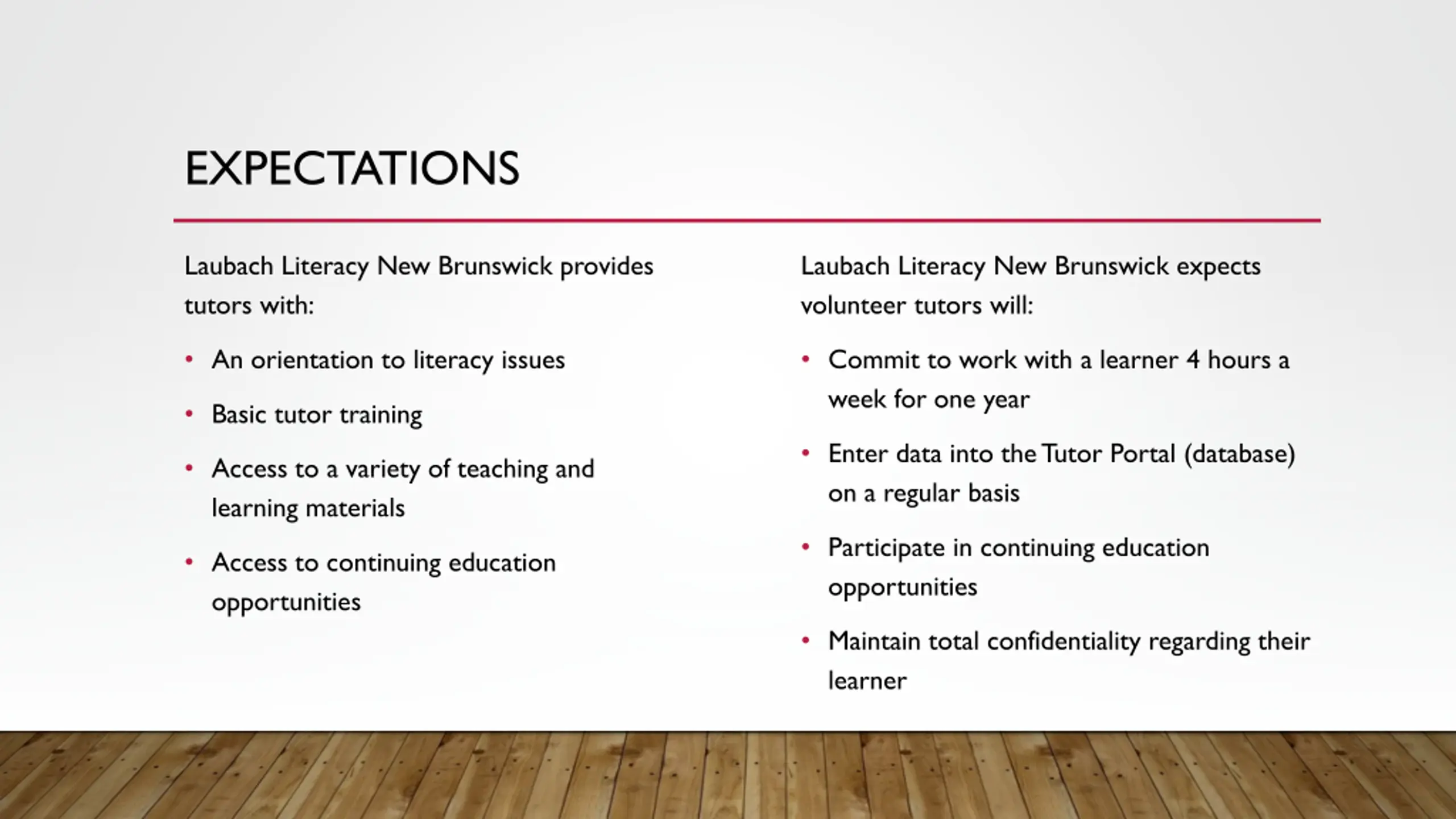 EXPECTATIONS Laubach Literacy New Brunswick provides tutors with: Laubach Literacy New Brunswick expects volunteer tutors will: An orientation to literacy issues Commit to work with a learner 4 hours a week for one year Basic tutor training Enter data into the Tutor Portal (database) on a regular basis Access to a variety of teaching and learning materials Participate in continuing education opportunities Access to continuing education opportunities Maintain total confidentiality regarding their learner