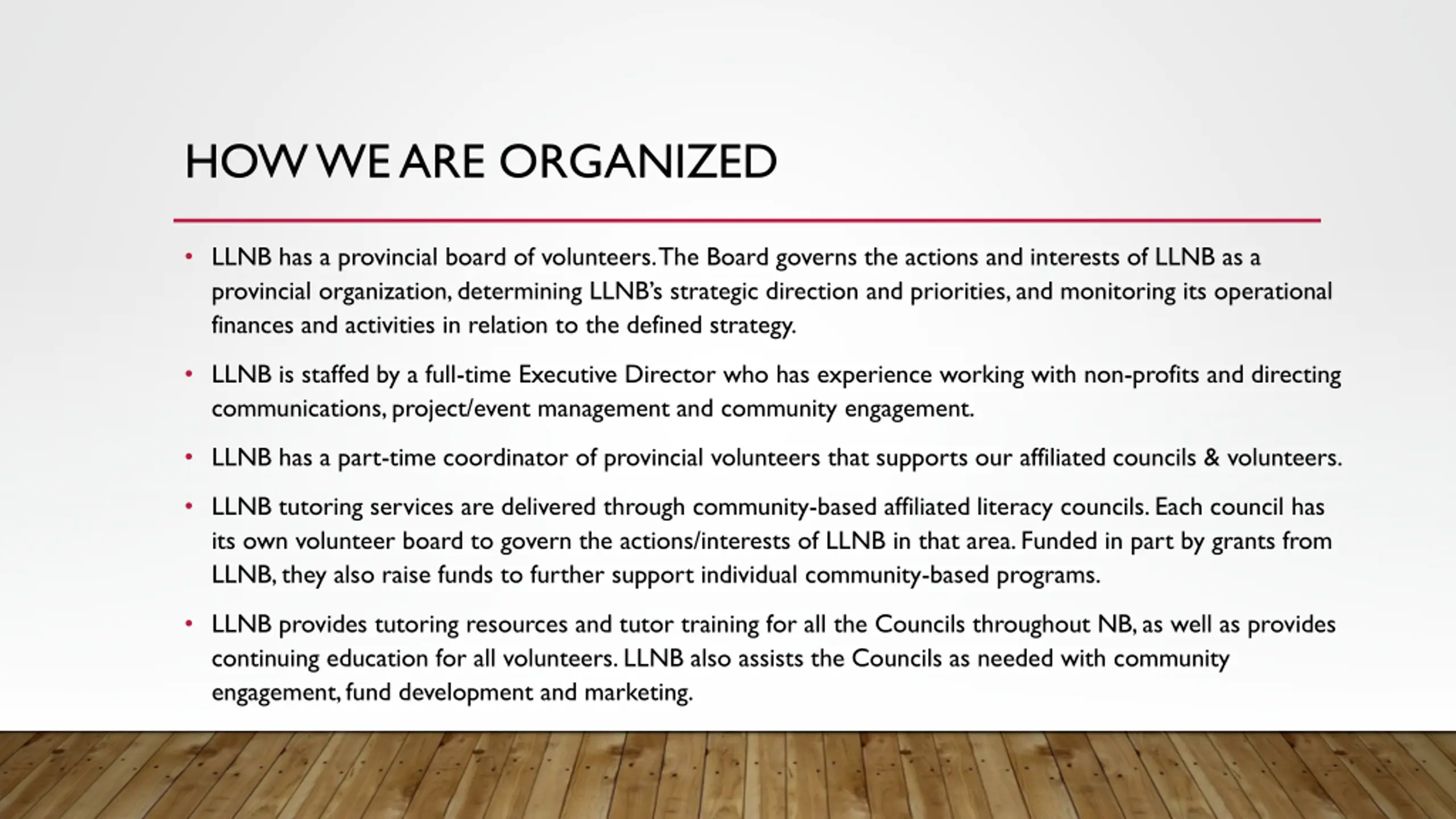 HOW WE ARE ORGANIZED LLNB has a provincial board of volunteers. The Board governs the actions and interests of LLNB as a provincial organization, determining LLNB s strategic direction and priorities, and monitoring its operational finances and activities in relation to the defined strategy. LLNB is staffed by a full-time Executive Director who has experience working with non-profits and directing communications, project/event management and community engagement. LLNB has a part-time coordinator of provincial volunteers that supports our affiliated councils & volunteers. LLNB tutoring services are delivered through community-based affiliated literacy councils. Each council has its own volunteer board to govern the actions/interests of LLNB in that area. Funded in part by grants from LLNB, they also raise funds to further support individual community-based programs. LLNB provides tutoring resources and tutor training for all the Councils throughout NB, as well as provides continuing education for all volunteers.LLNB also assists the Councils as needed with community engagement, fund development and marketing.
