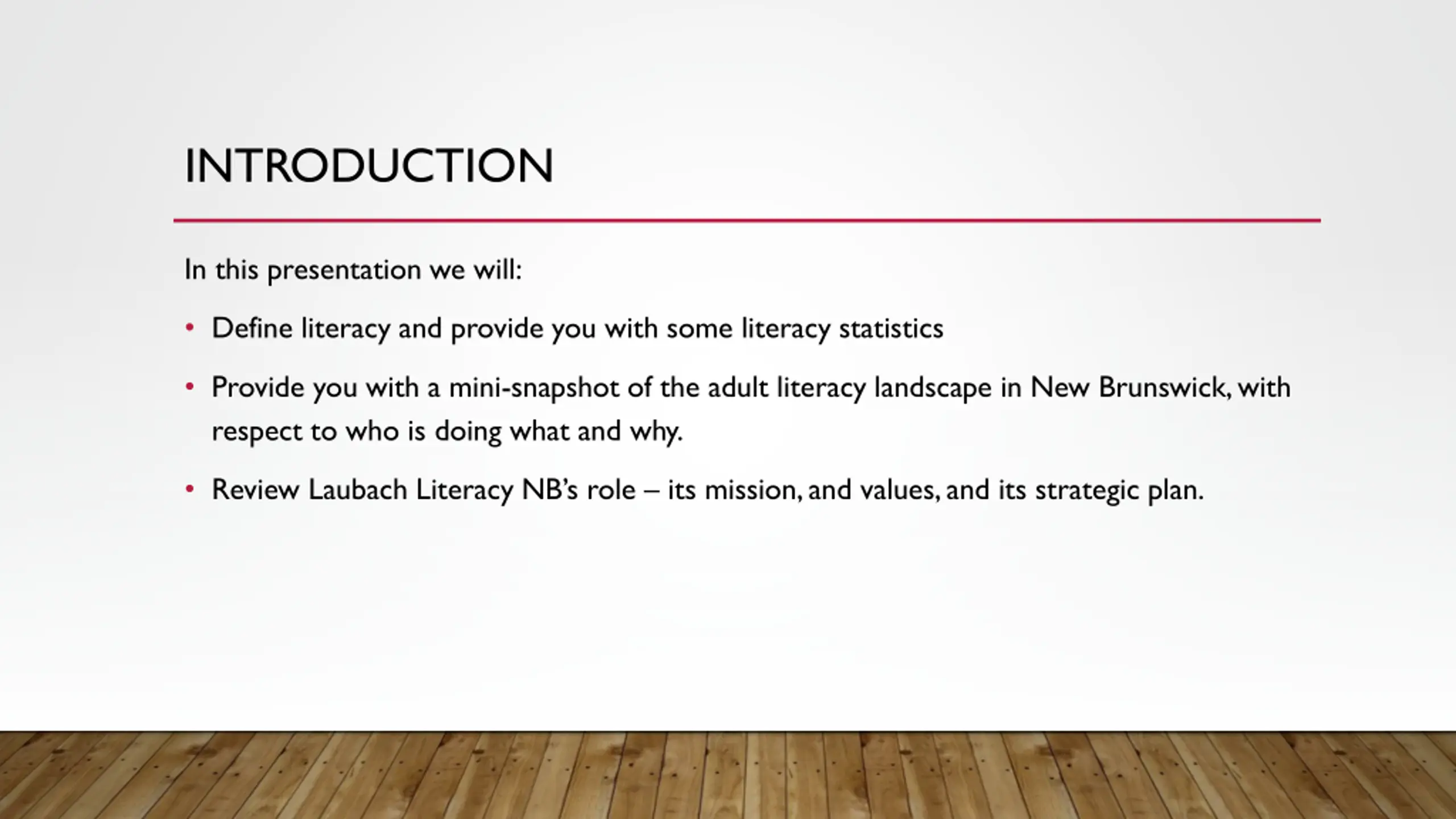 INTRODUCTION In this presentation we will: Define literacy and provide you with some literacy statistics Provide you with a mini-snapshot of the adult literacy landscape in New Brunswick, with respect to who is doing what and why. Review Laubach Literacy NB s role its mission, and values, and its strategic plan.