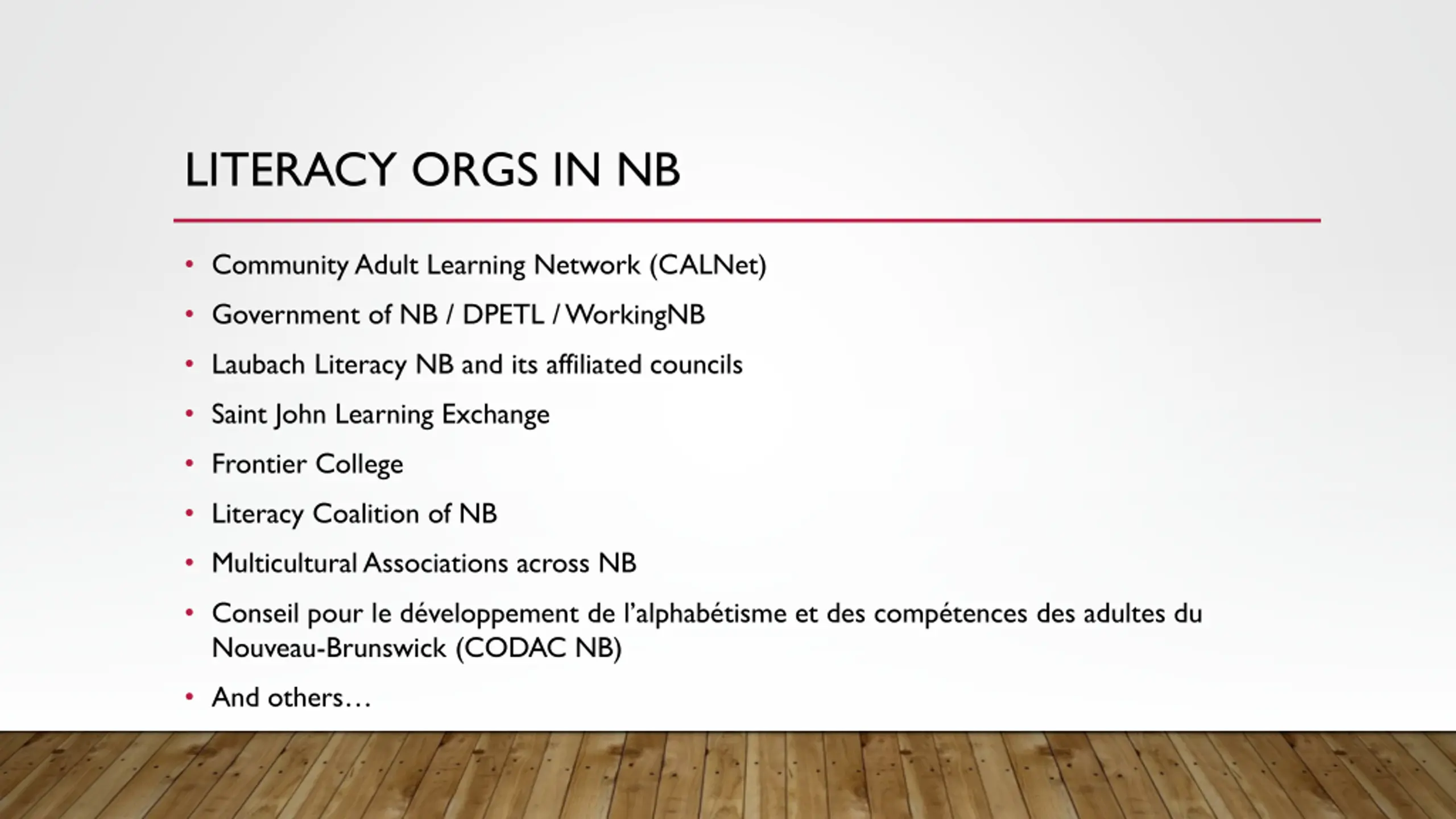 LITERACY ORGS IN NB Community Adult Learning Network (CALNet) Government of NB / DPETL / WorkingNB Laubach Literacy NB and its affiliated councils Saint John Learning Exchange Frontier College Literacy Coalition of NB Multicultural Associations across NB Conseil pour le d veloppement de l alphab tisme et des comp tences des adultes du Nouveau-Brunswick (CODAC NB) And others