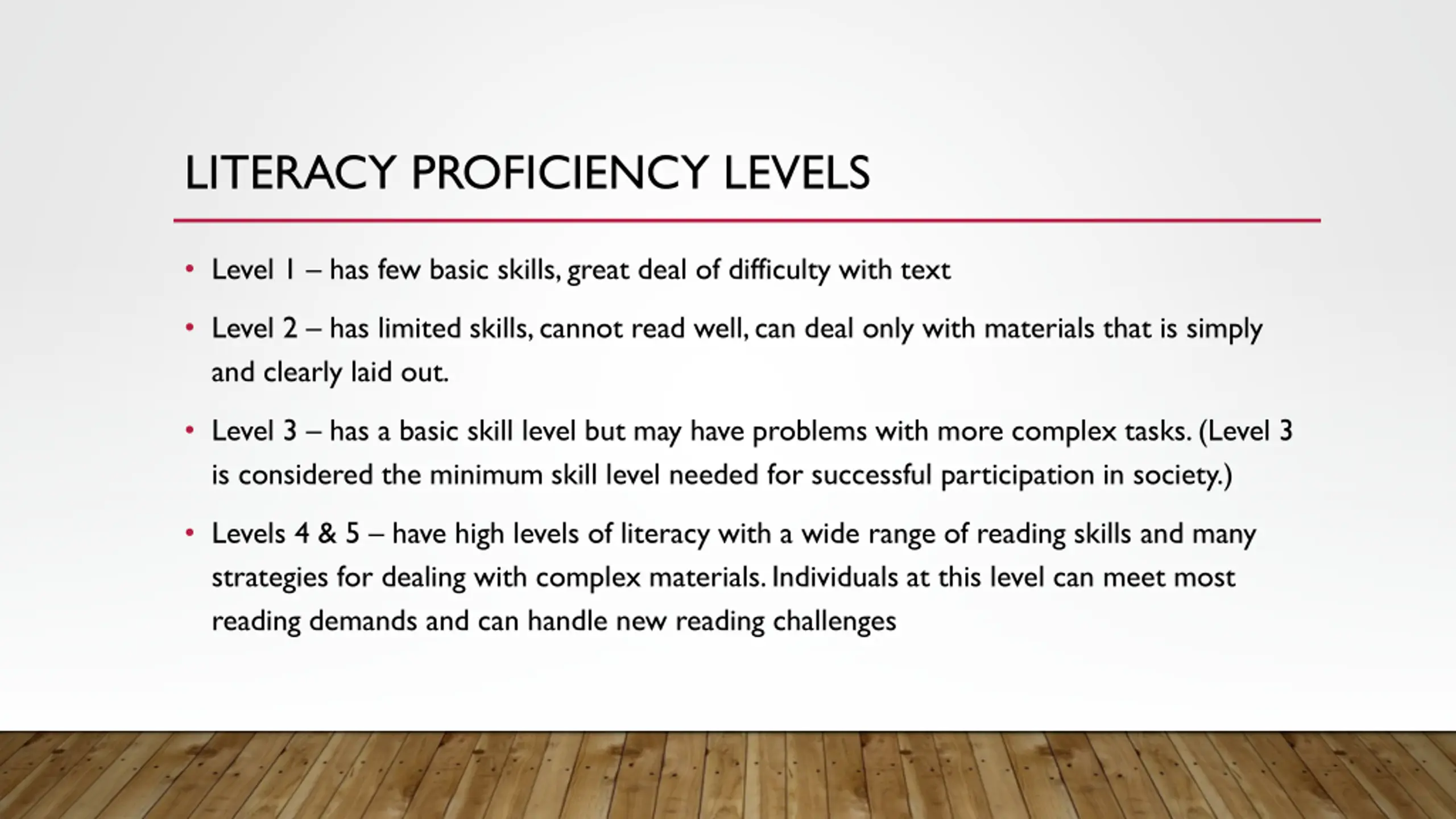 LITERACY PROFICIENCY LEVELS Level 1 has few basic skills, great deal of difficulty with text Level 2 has limited skills, cannot read well, can deal only with materials that is simply and clearly laid out. Level 3 has a basic skill level but may have problems with more complex tasks. (Level 3 is considered the minimum skill level needed for successful participation in society.) Levels 4 & 5 have high levels of literacy with a wide range of reading skills and many strategies for dealing with complex materials. Individuals at this level can meet most reading demands and can handle new reading challenges